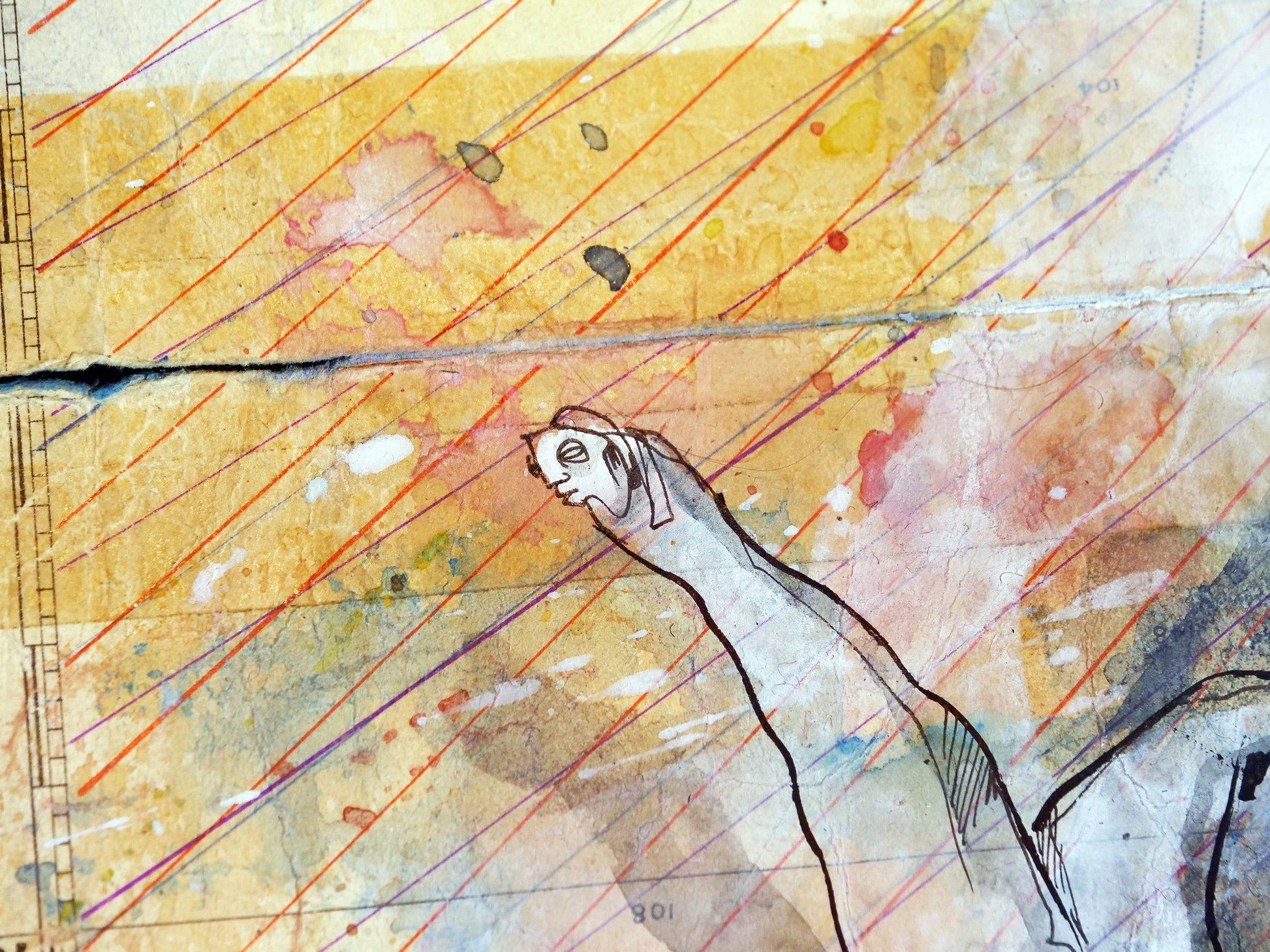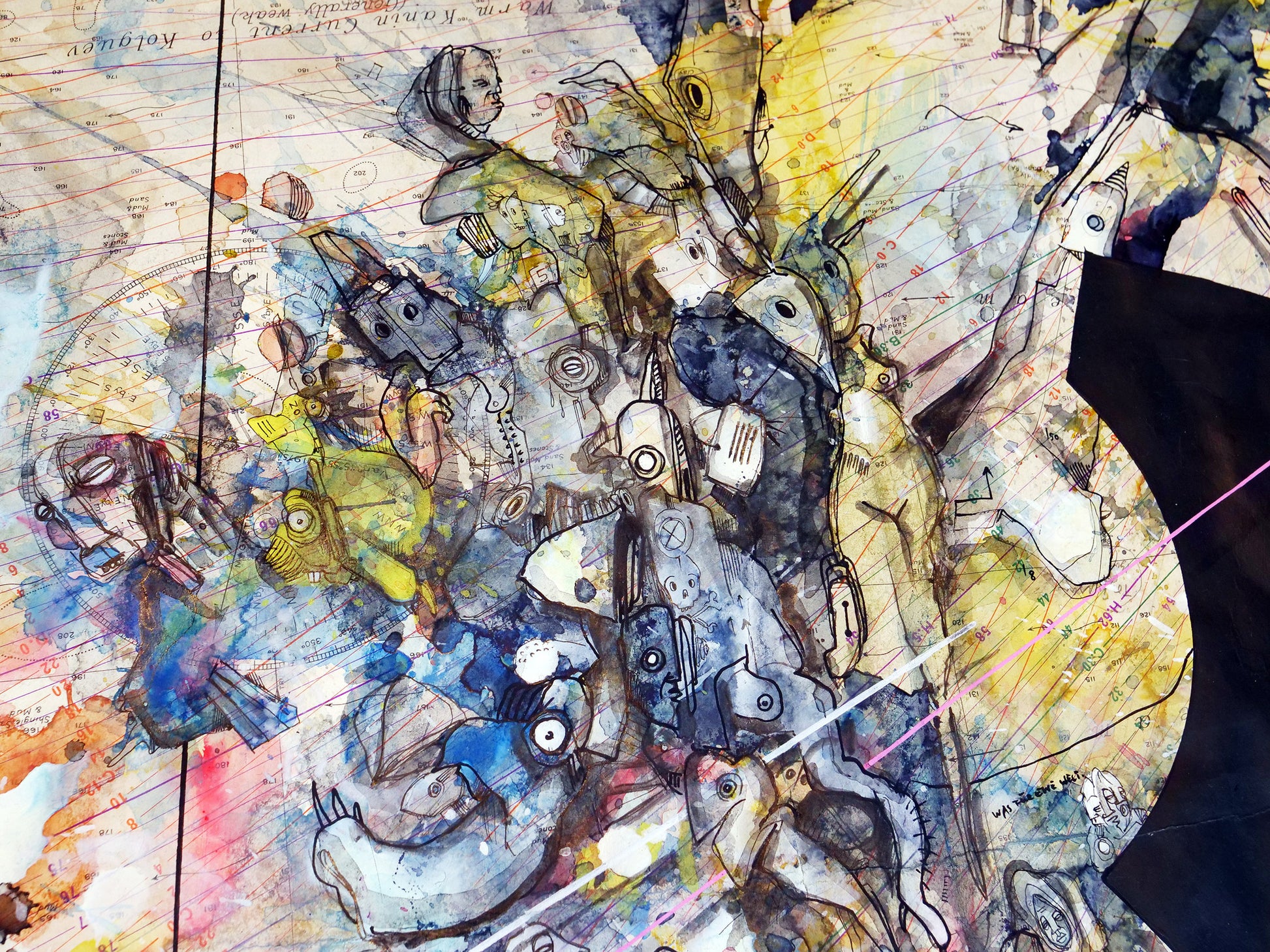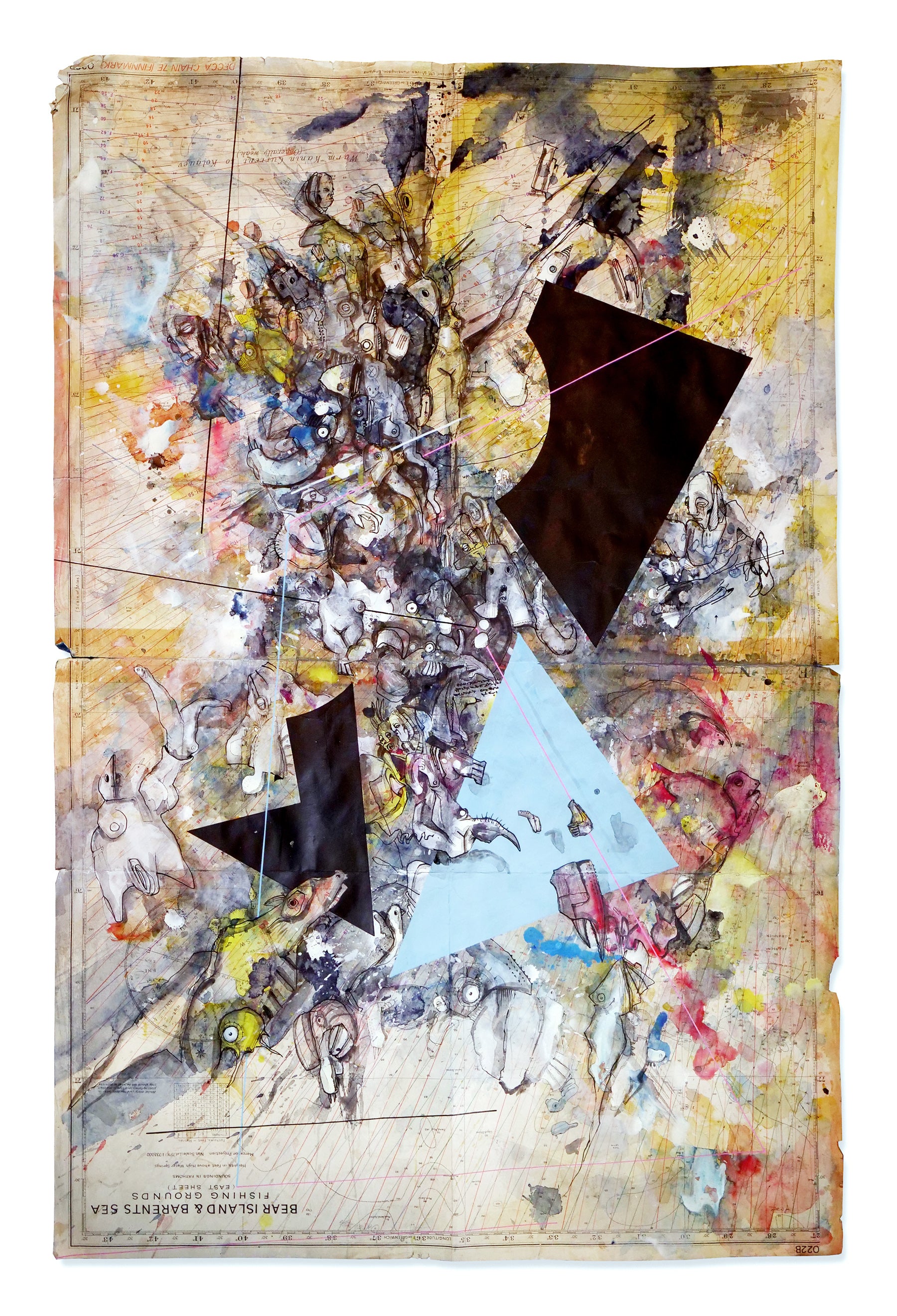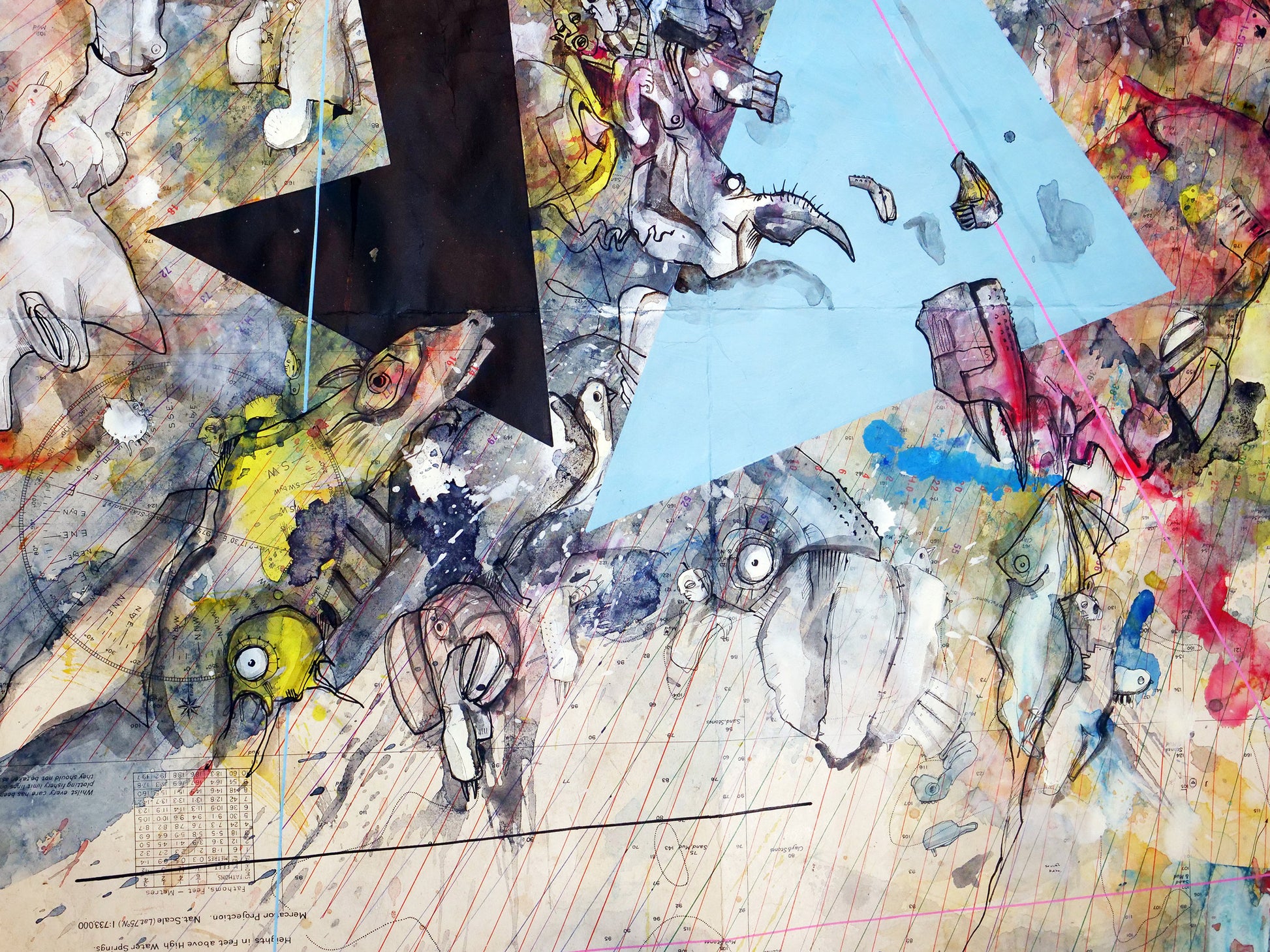 Watercolor/acrylic/pigment ink on paper (atlas map)