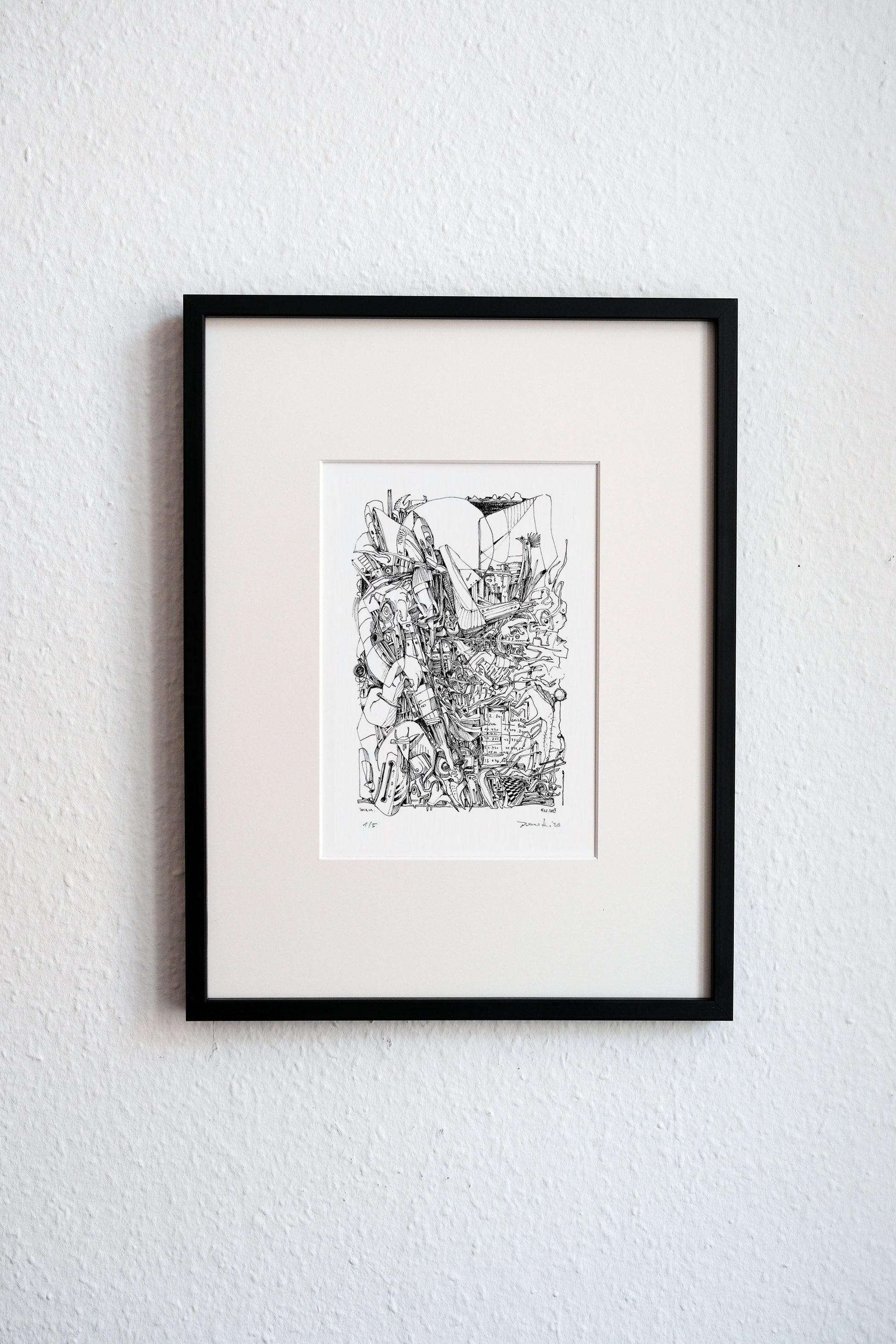 Der schwarze Rahmen mit Passpartout (mit Bildausschnitt von 23cm x 16cm) hebt das einzelne Blatt und den Druck der Zeichnung besonders hervor. Das Glas ist entspiegelt und hat einen UV-Schutz (60%).
