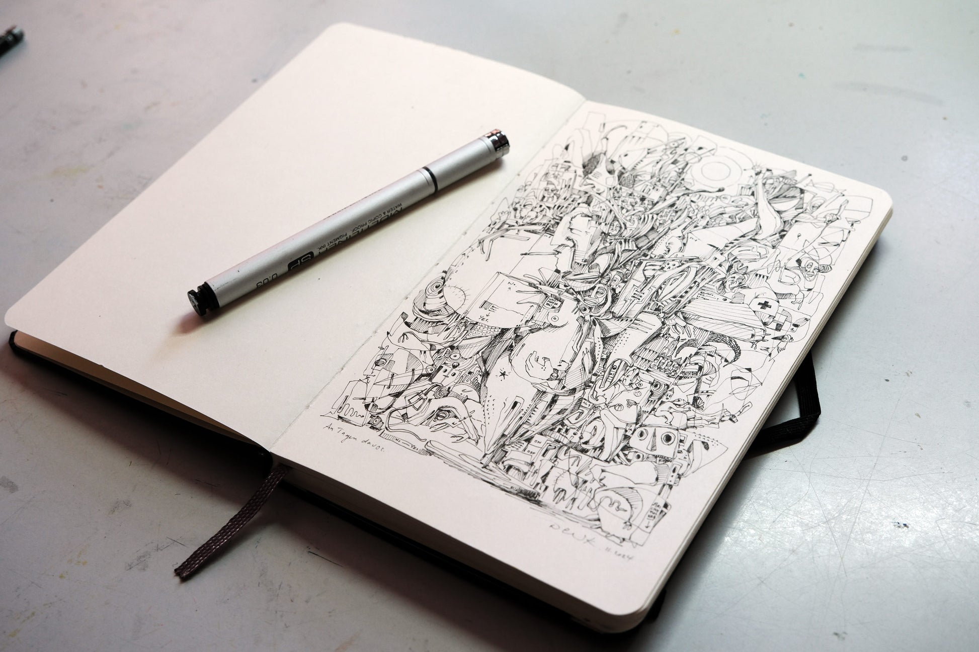 Diese beeindruckenden Drucke auf hochwertigem Hahnemühle-Papier fangen die Essenz von Kriesels visionären Zeichnungen ein, die ursprünglich in einem Skizzenbuch aus dem Jahr 2025 entstanden. Inspiriert von der Idee, eine Motivwelt für ein Tarot-Kartendeck zu erschaffen, knüpft Kriesel an die reiche Tradition der Surrealisten an, die sich ebenfalls vom Tarot faszinieren ließen.