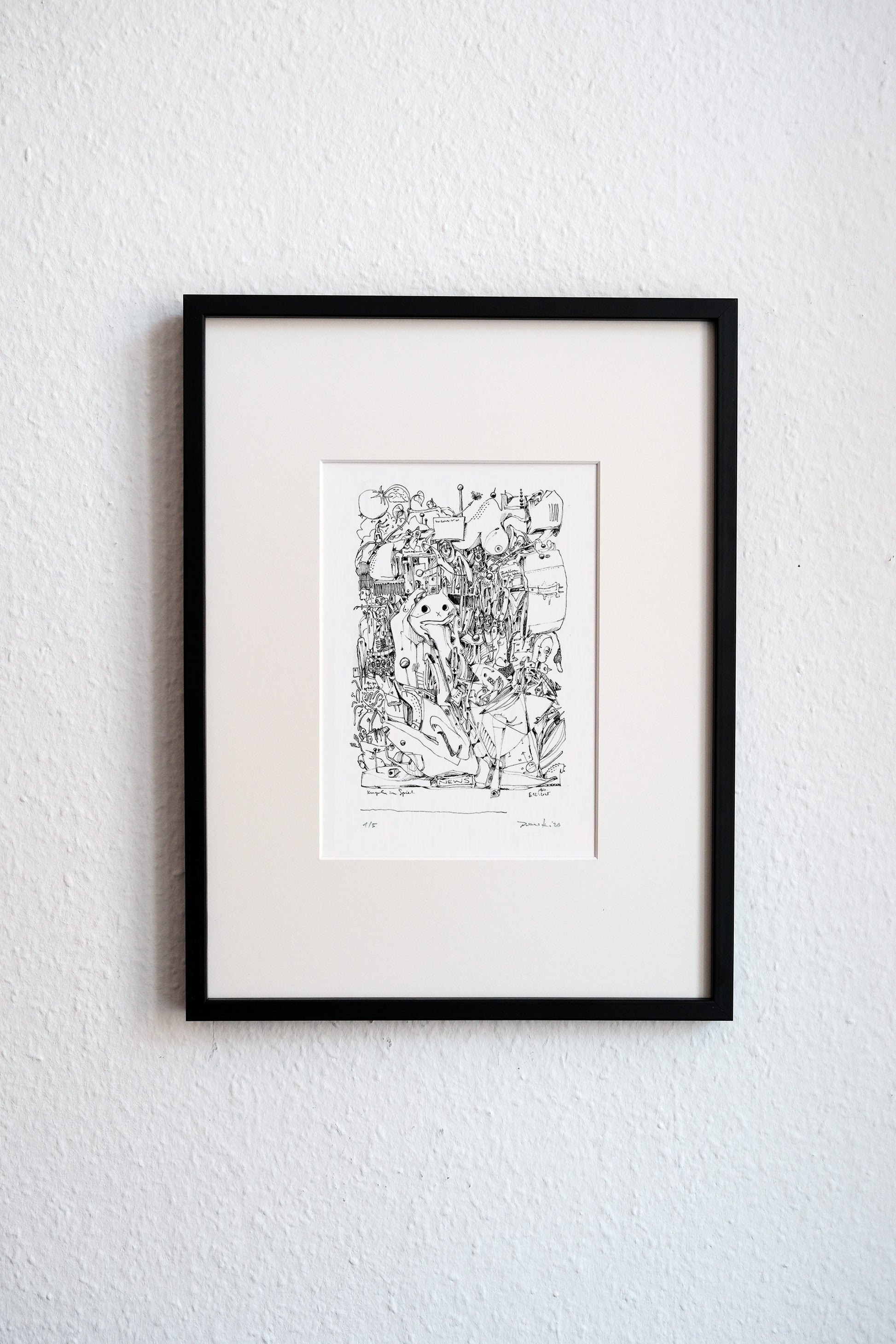 Der schwarze Rahmen mit Passpartout (mit Bildausschnitt von 23cm x 16cm) hebt das einzelne Blatt und den Druck der Zeichnung besonders hervor. Das Glas ist entspiegelt und hat einen UV-Schutz (60%).