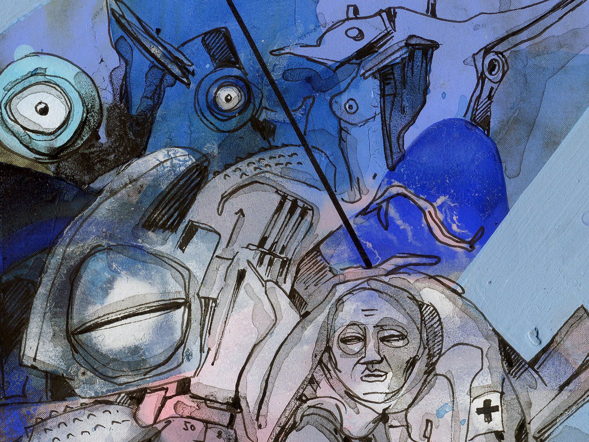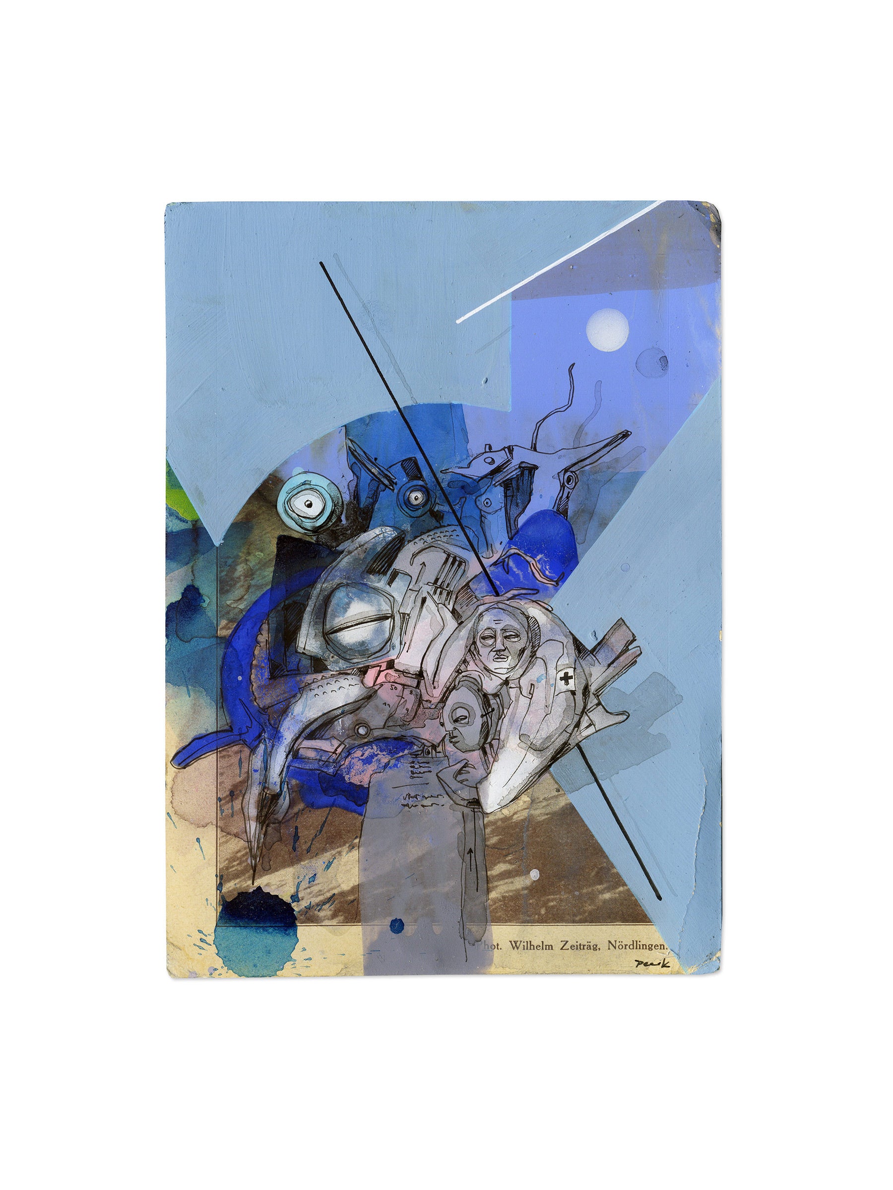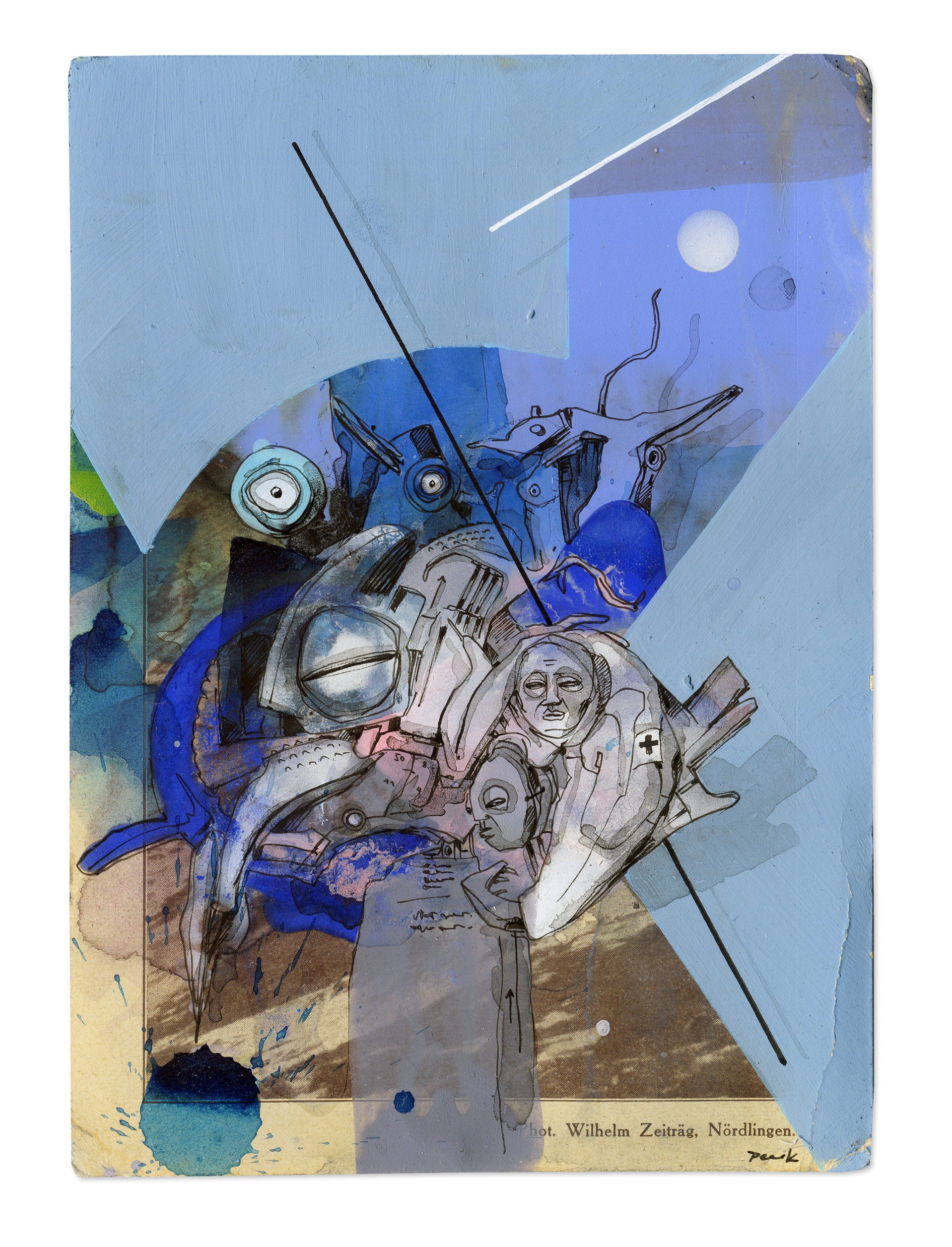 Eine Surrealistische Zeichnung (Unikat) aus der Werkreihe der Übermalungen (Postkarten).