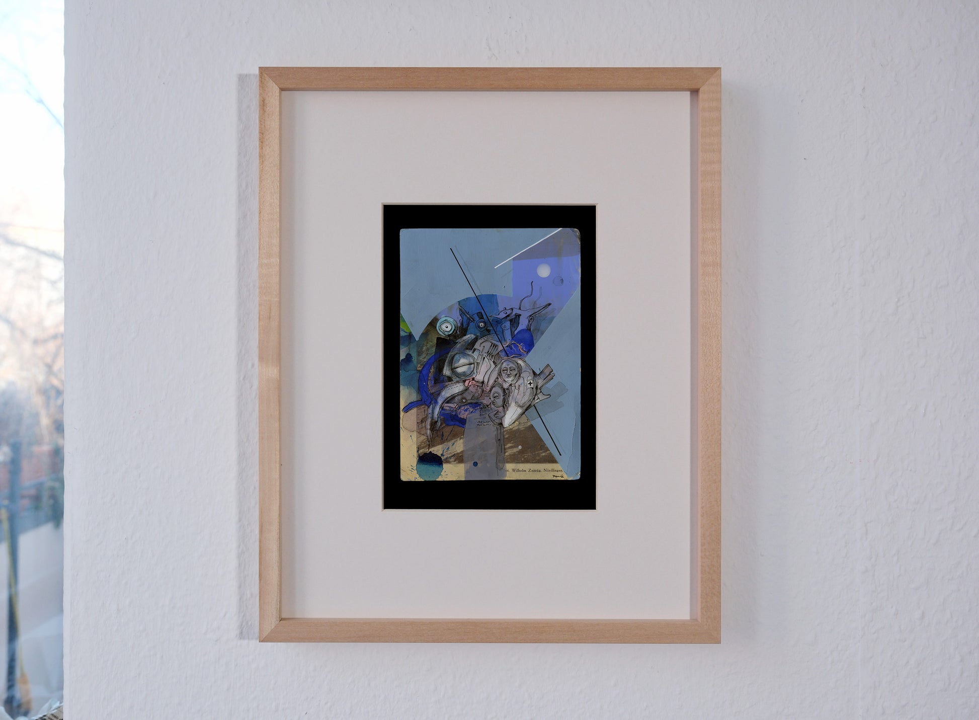 Das Werk ist gerahmt in 30cm × 24cm (Holz) mit Passepartout auf dunklem Hintergrund.