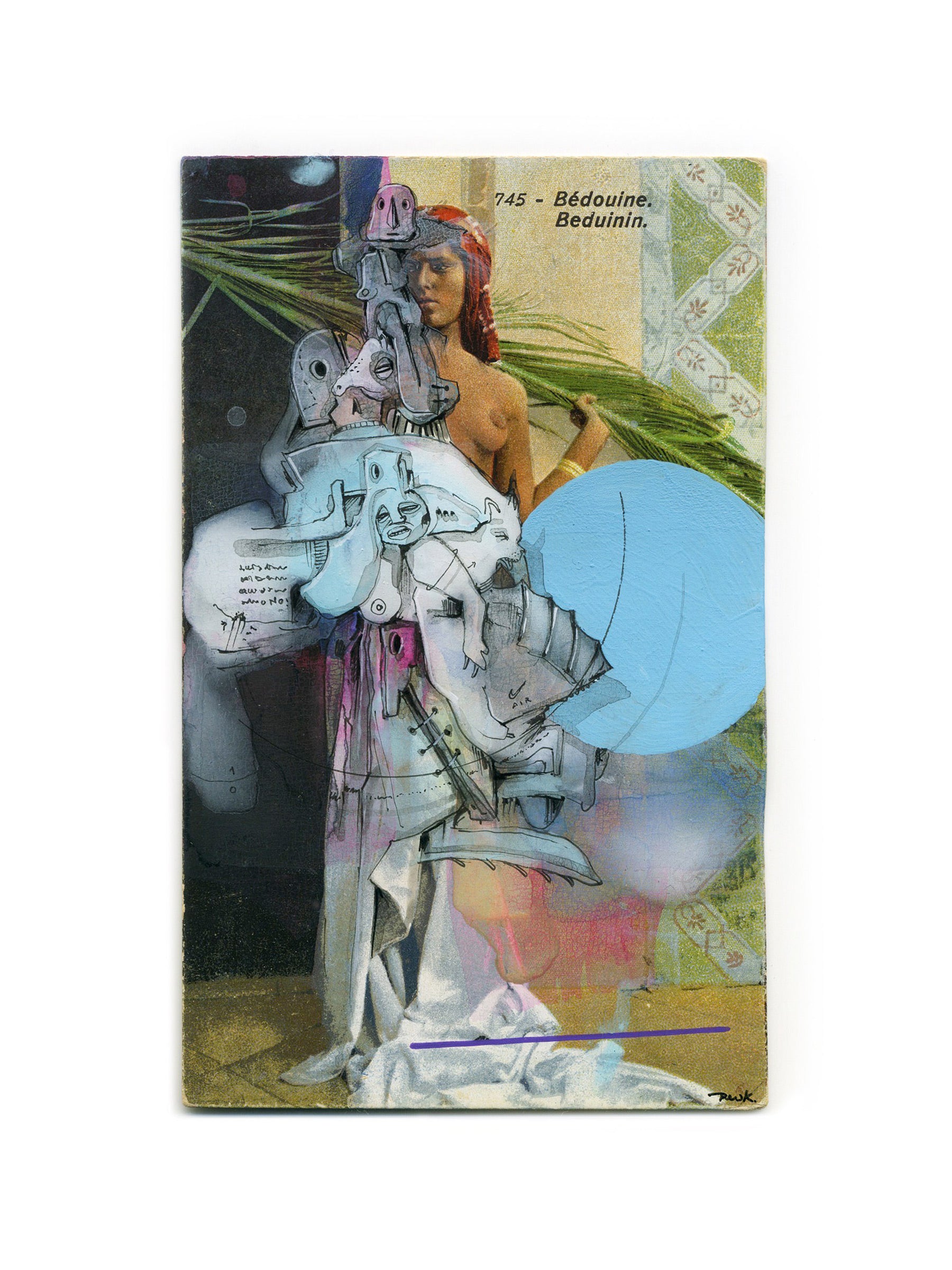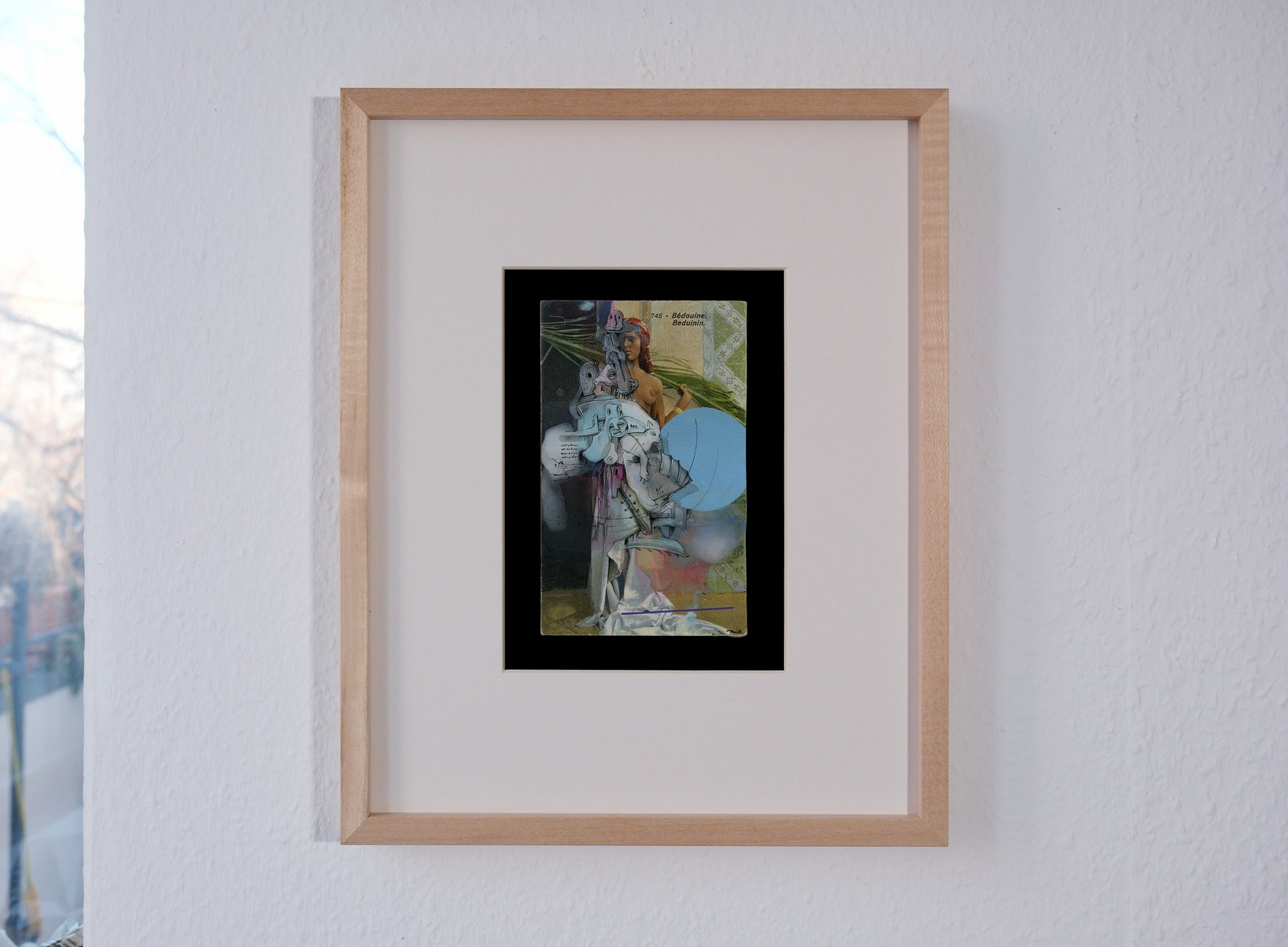 Eine Surrealistische Zeichnung (Unikat) aus der Werkreihe der Übermalungen (Postkarten).