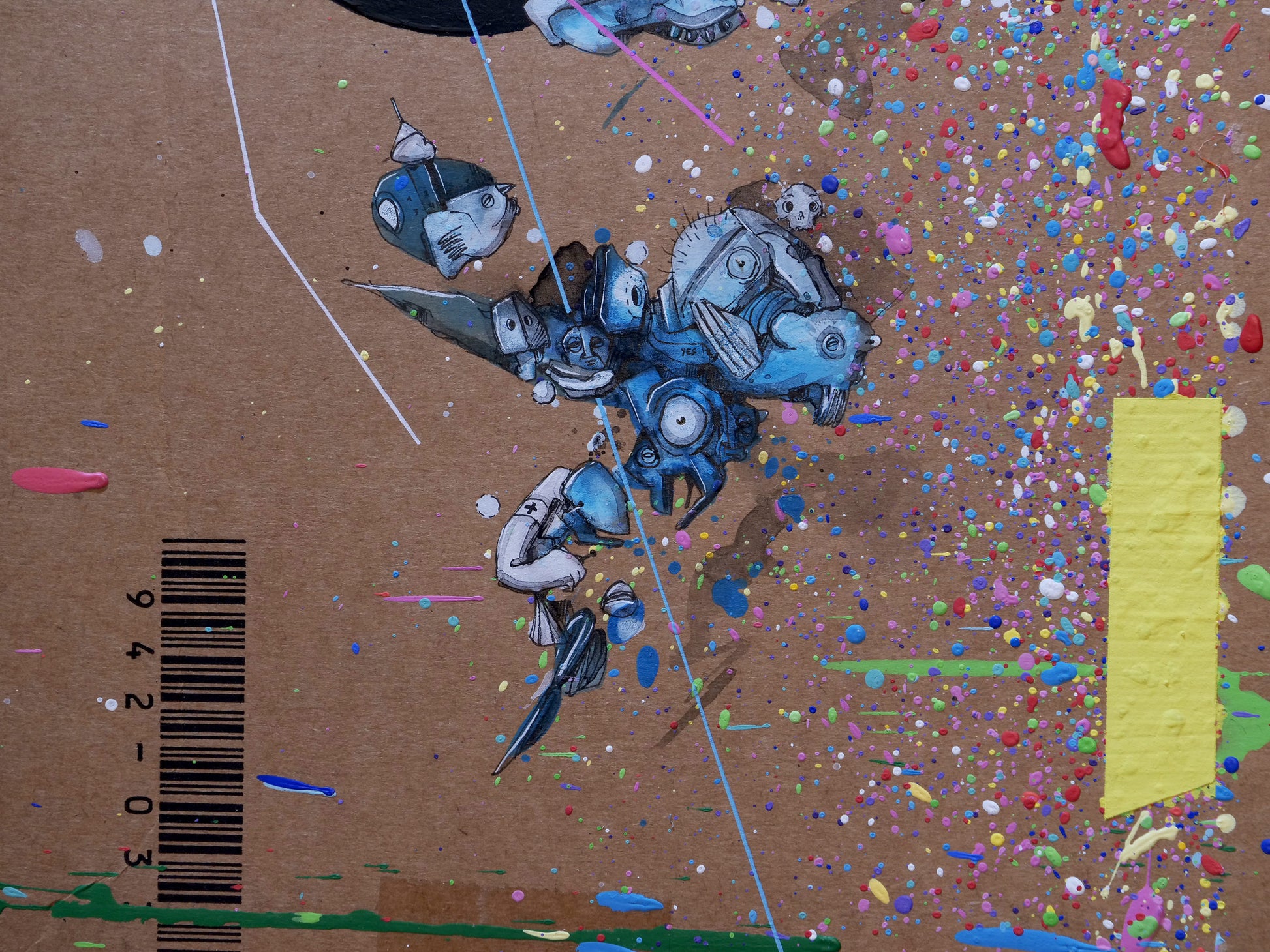 Das Herzstück des Werks bildet eine detailreiche, figurative Wimmelbildzeichnung, mit Pigmenttinten-Fineliner ausgeführt. Diese filigrane Zeichnung, bevölkert von Kriesels charakteristischen surrealen Fratzen und Figuren, steht in faszinierendem Gegensatz zur rauen Textur der Pappe. Farbige Akzente in Acryl und Aquarell verleihen dem Werk zusätzliche Tiefe und Lebendigkeit, wodurch ein dynamisches Spannungsfeld zwischen dem rohen Untergrund und der komplexen künstlerischen Intervention entsteht.