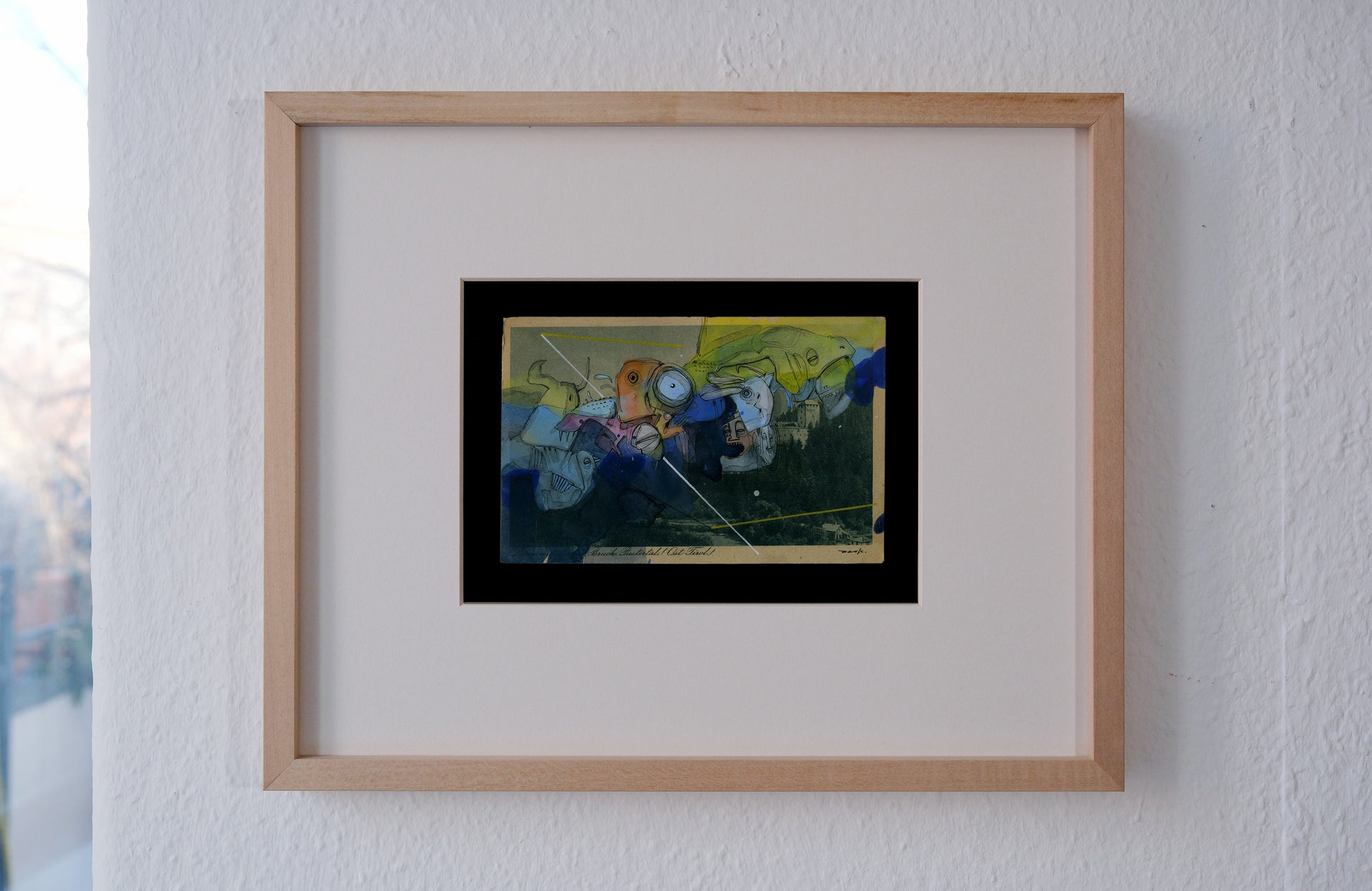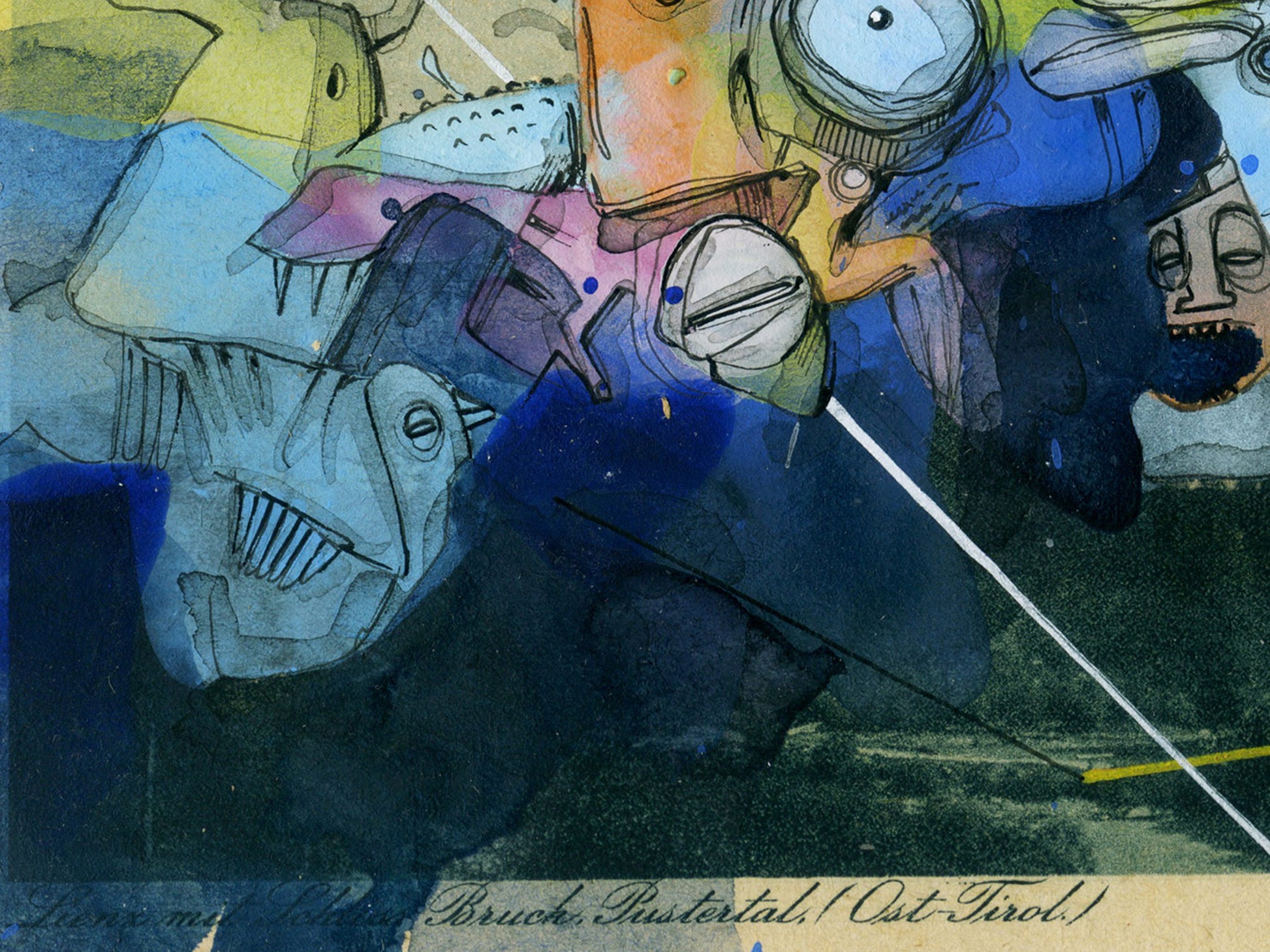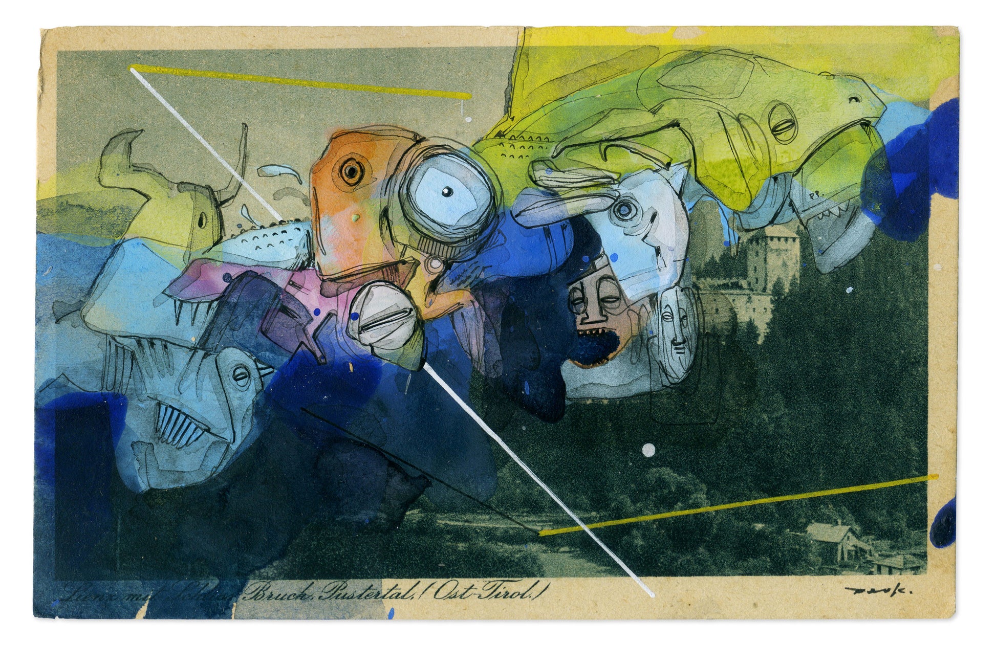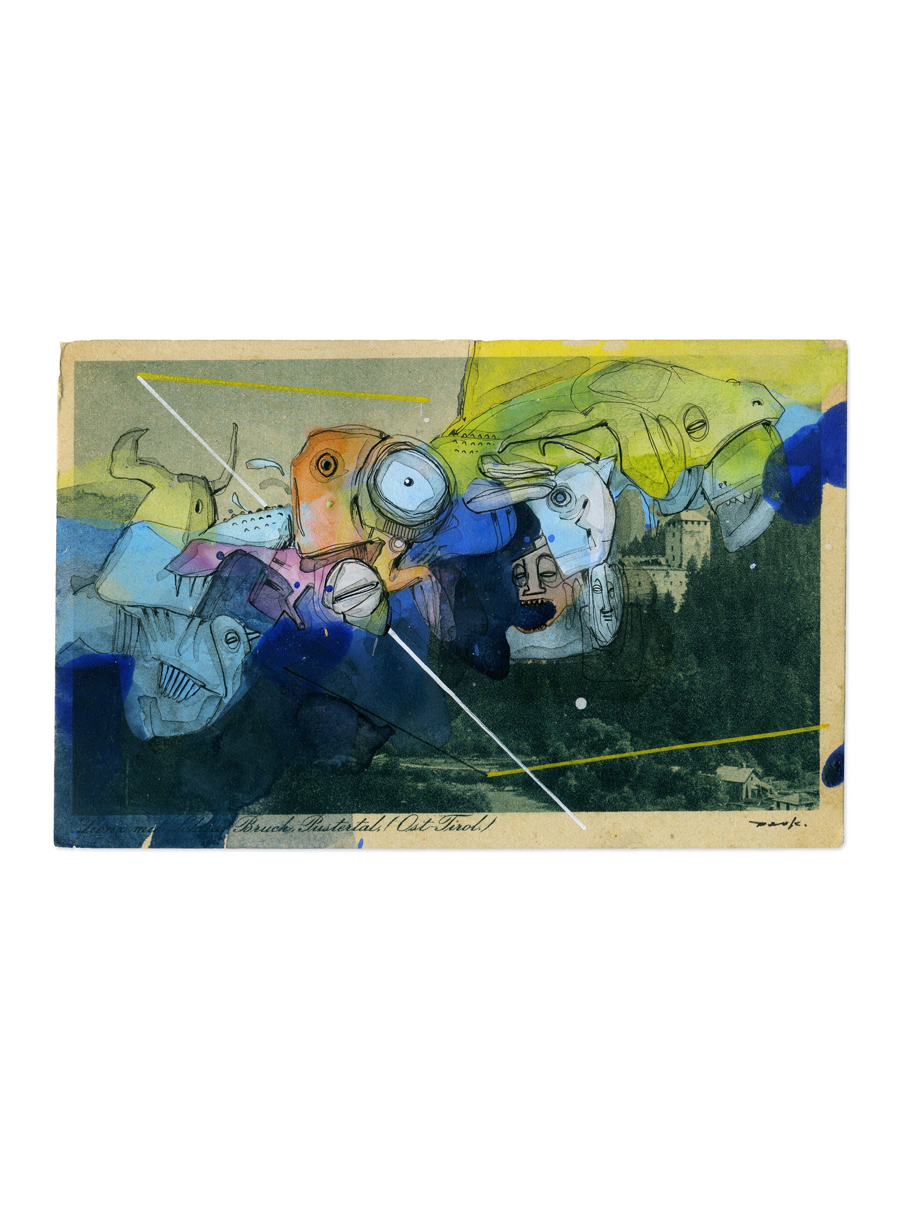 Eine Surrealistische Zeichnung (Unikat) aus der Werkreihe der Übermalungen (Postkarten).