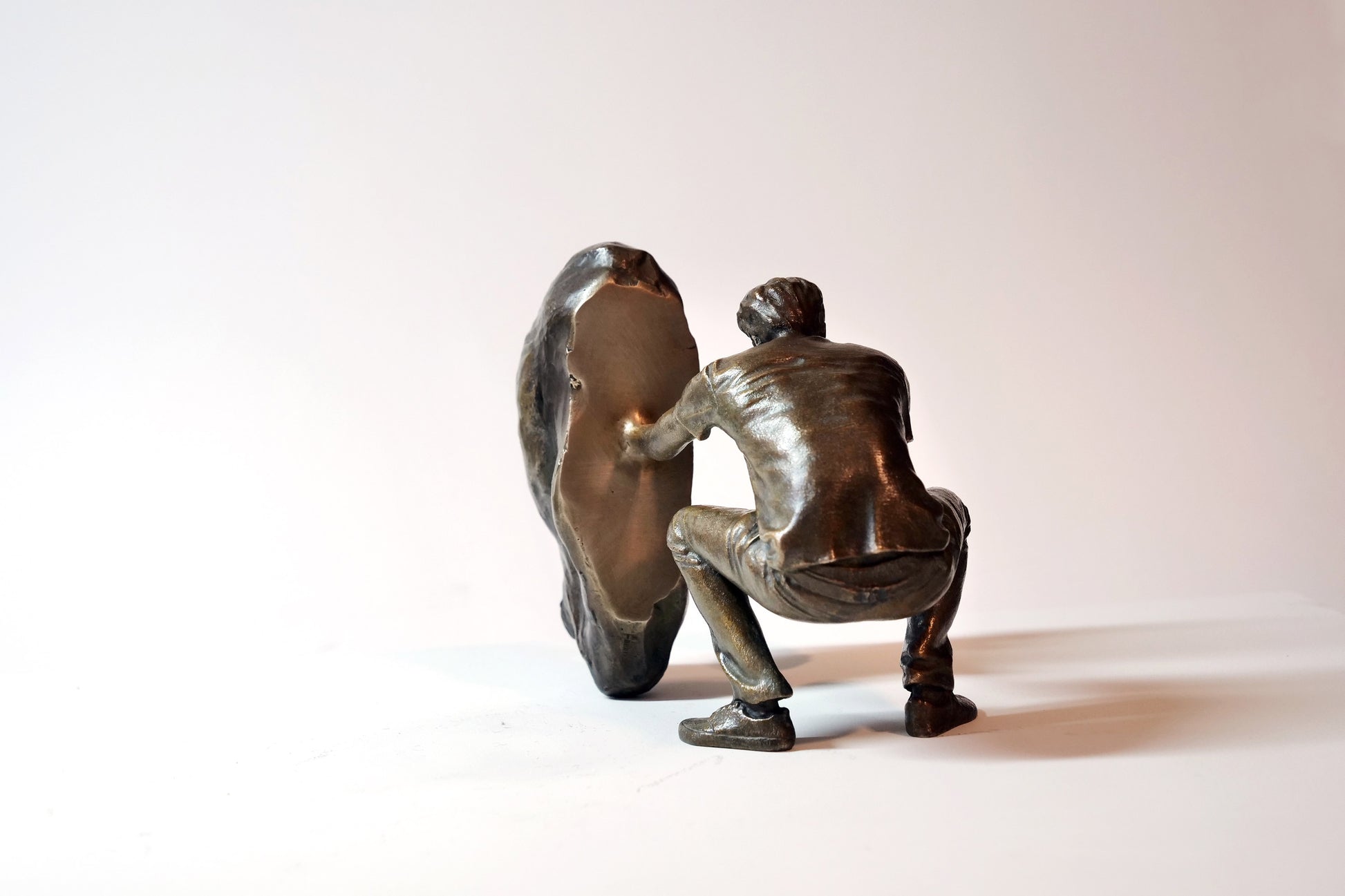 In seiner Bronze-Skulptur "Gefährlich nah" präsentiert der Berliner Künstler Peer Kriesel eine faszinierende Weiterentwicklung seiner bekannten Me so small-Serie. Diese Arbeit markiert einen bedeutenden Wendepunkt in Kriesels künstlerischem Schaffen, indem sie das Konzept der kleinen, oft in 3D-Druck realisierten Figuren in das edle und dauerhafte Medium der Bronze überführt.