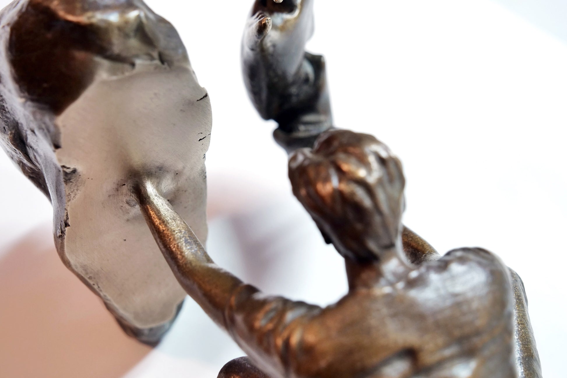 Die Wahl der Bronze als Material unterstreicht die Dauerhaftigkeit dieser Themen. Während digitale Inhalte flüchtig sind, manifestiert die Skulptur diese Diskurse in einer greifbaren, unvergänglichen Form. Sie lädt den Betrachter ein, über die Beständigkeit menschlicher Werte in einer sich rasant wandelnden digitalen Welt nachzudenken.