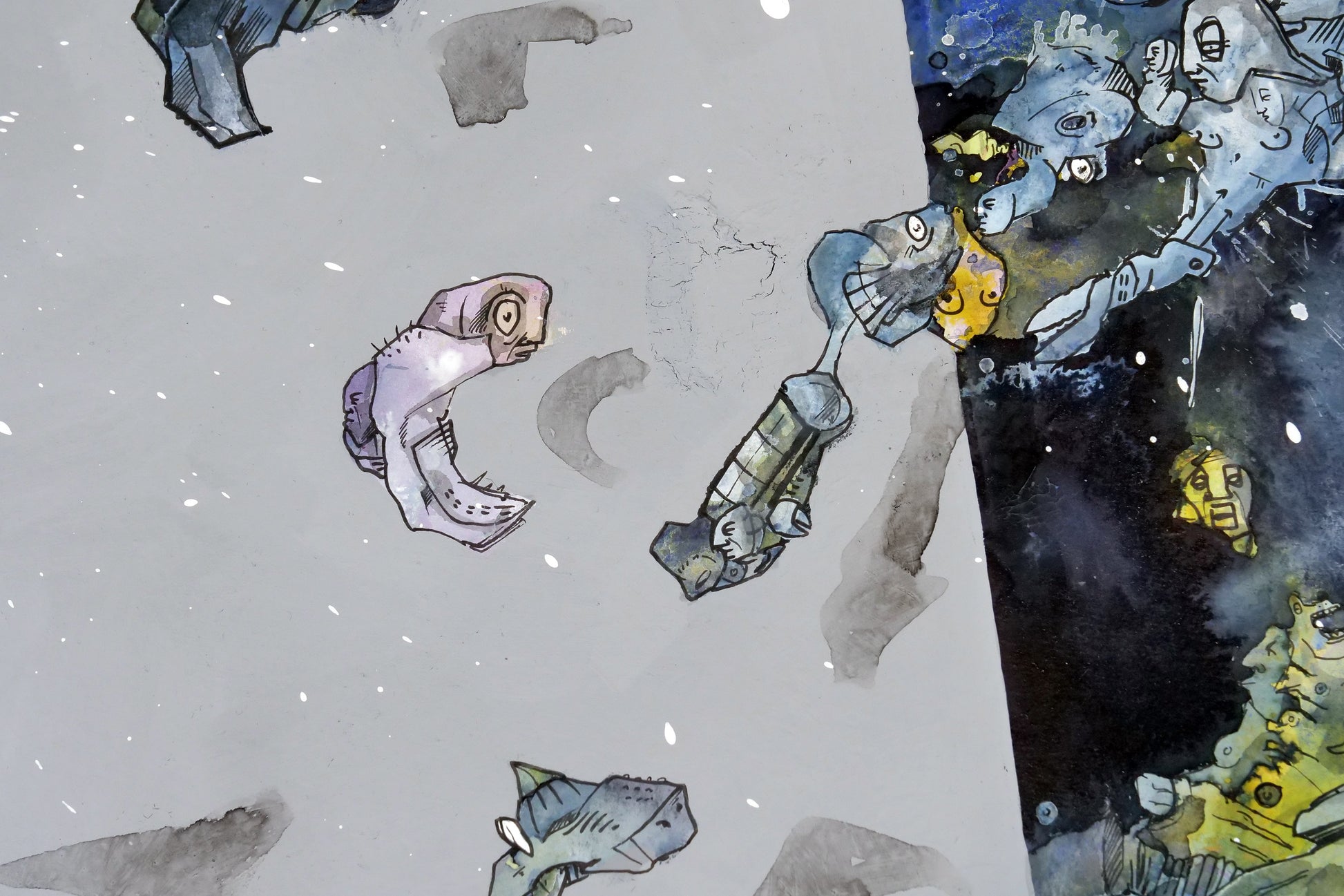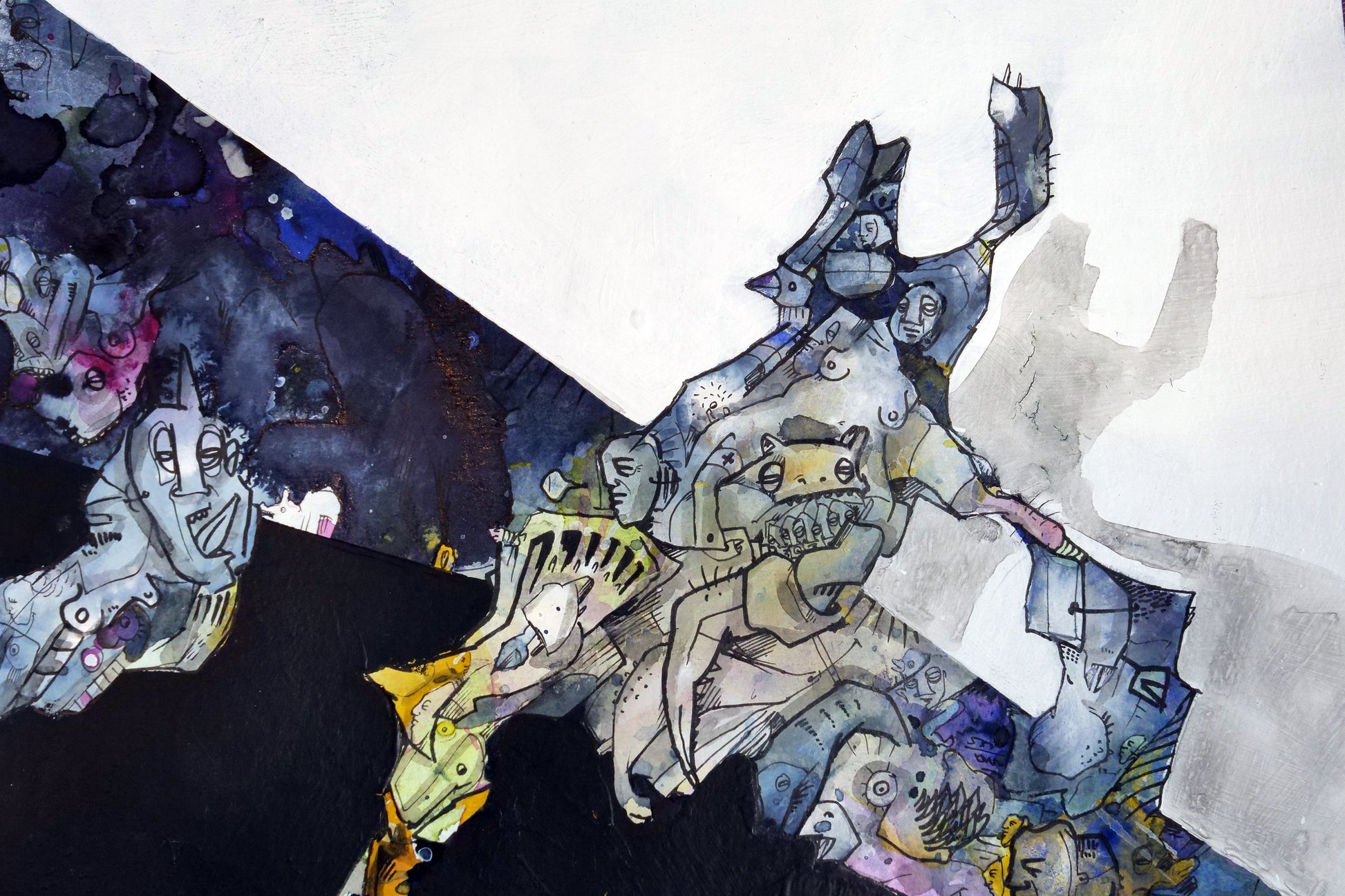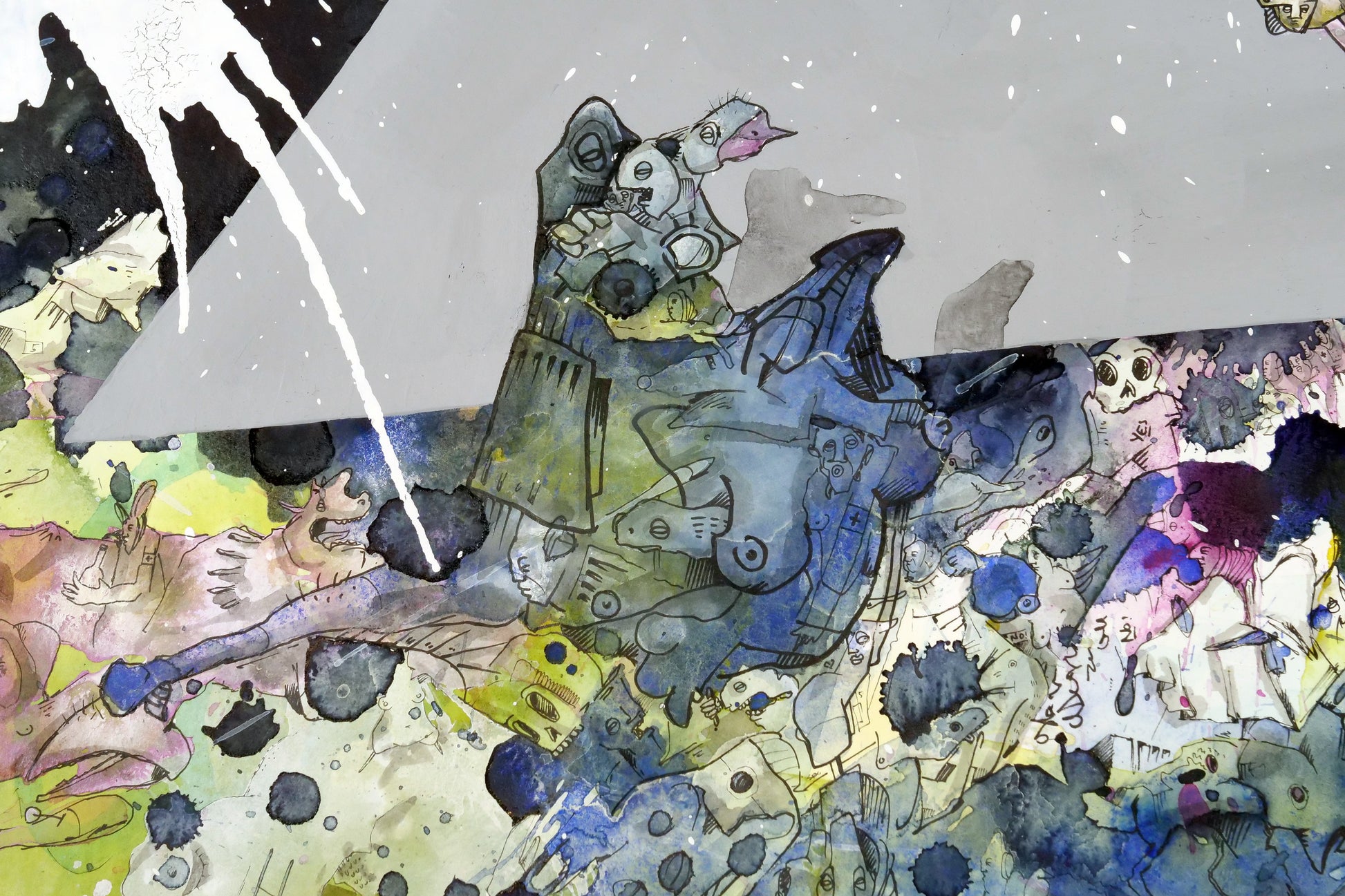 Im Zentrum dieses gigantischen Wimmelbildes steht ein faszinierendes Gewirr von Kriesels charakteristischen Figuren und Fratzen, das sich nahtlos über alle vier Teile erstreckt. Jede akribisch gezeichnete Gestalt erzählt ihre eigene Geschichte, während sie sich in ein größeres, zusammenhängendes Gesamtbild einfügt. Die überwältigende Detailfülle lädt zu einer epischen Entdeckungsreise ein, bei der jeder Blick, jeder Teilbereich neue Überraschungen und Zusammenhänge offenbart.