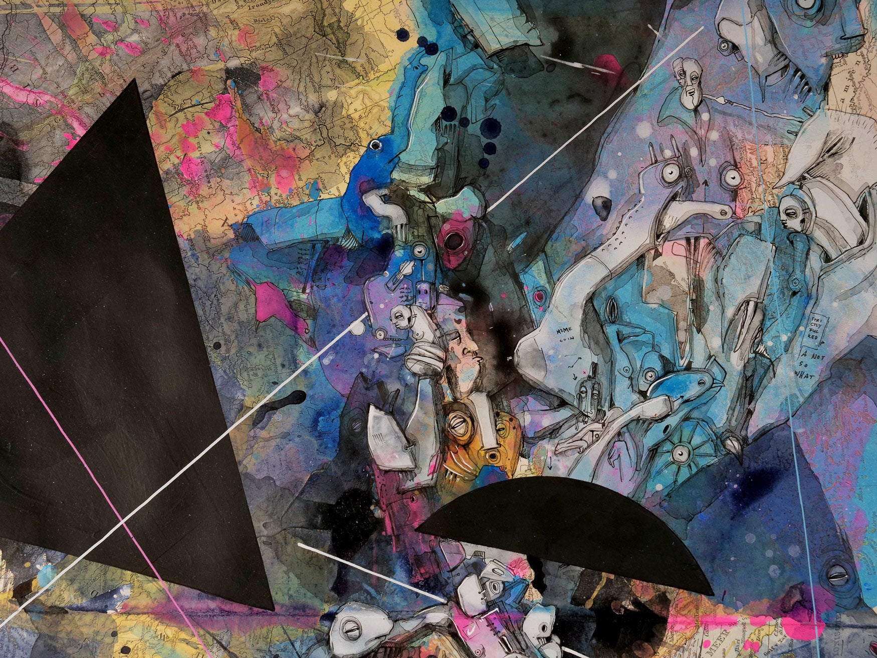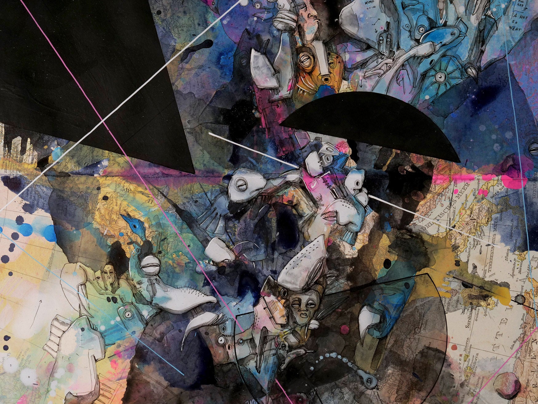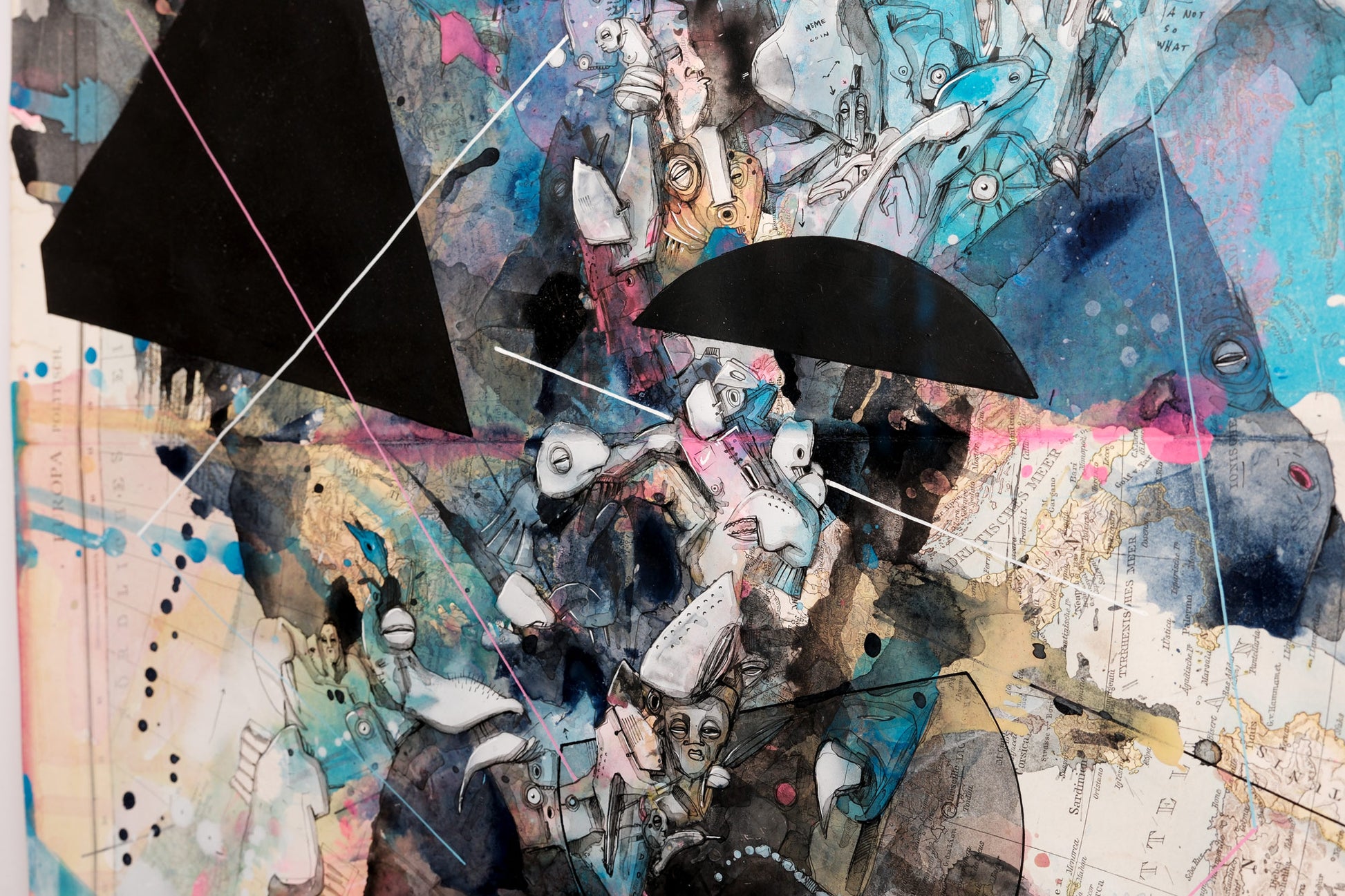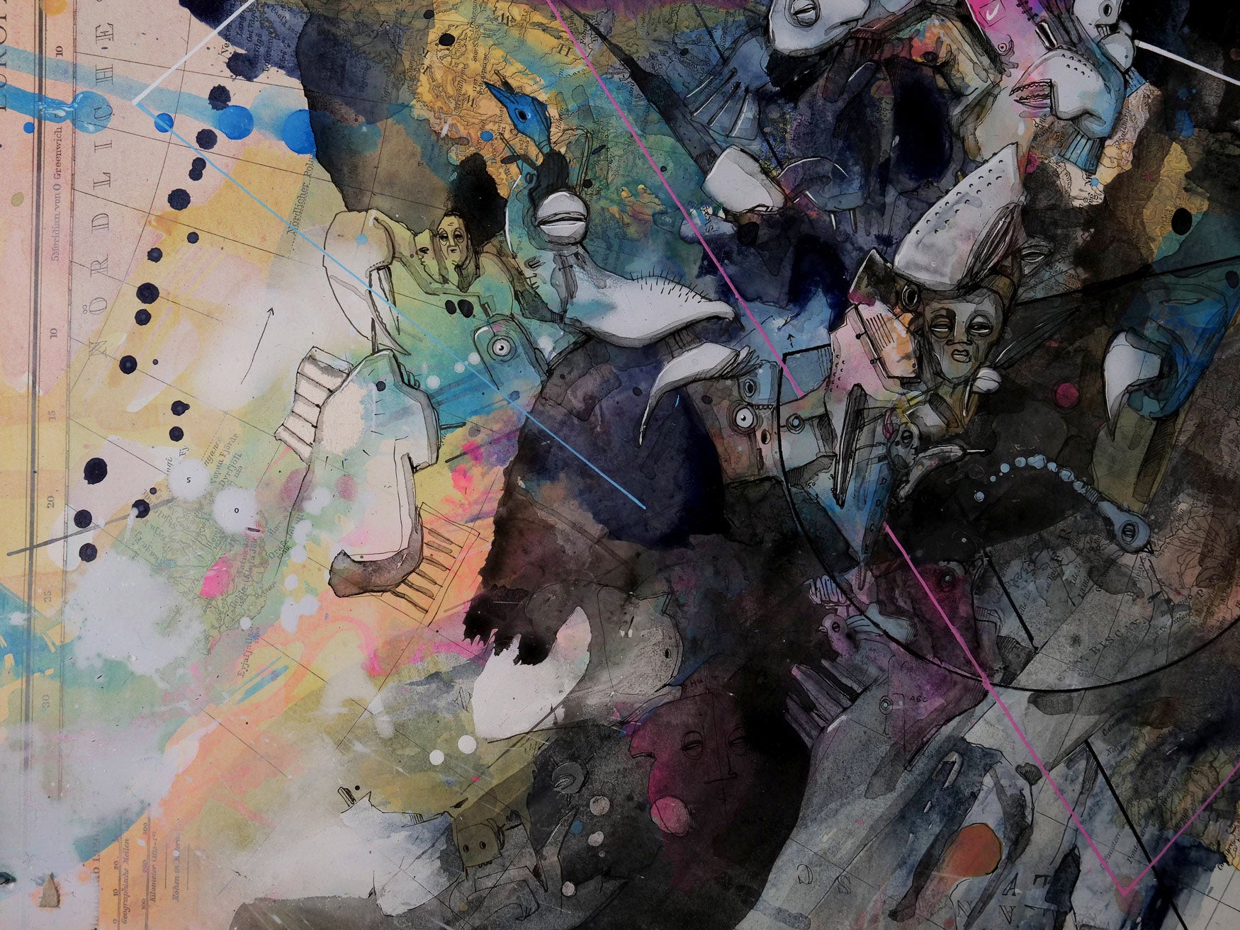 Im Zentrum des Werks steht die meisterhafte Übermalung mit Aquarell, Acryl und Pigmenttinte. Kriesels charakteristische Wimmelbilder, bevölkert von skurrilen Fratzen und fantastischen Figuren, überlagern und transformieren die geographischen Strukturen. Diese filigrane Zeichnung interagiert auf faszinierende Weise mit den Konturen und Farben der Karte und schafft so eine neue, imaginäre Topographie.