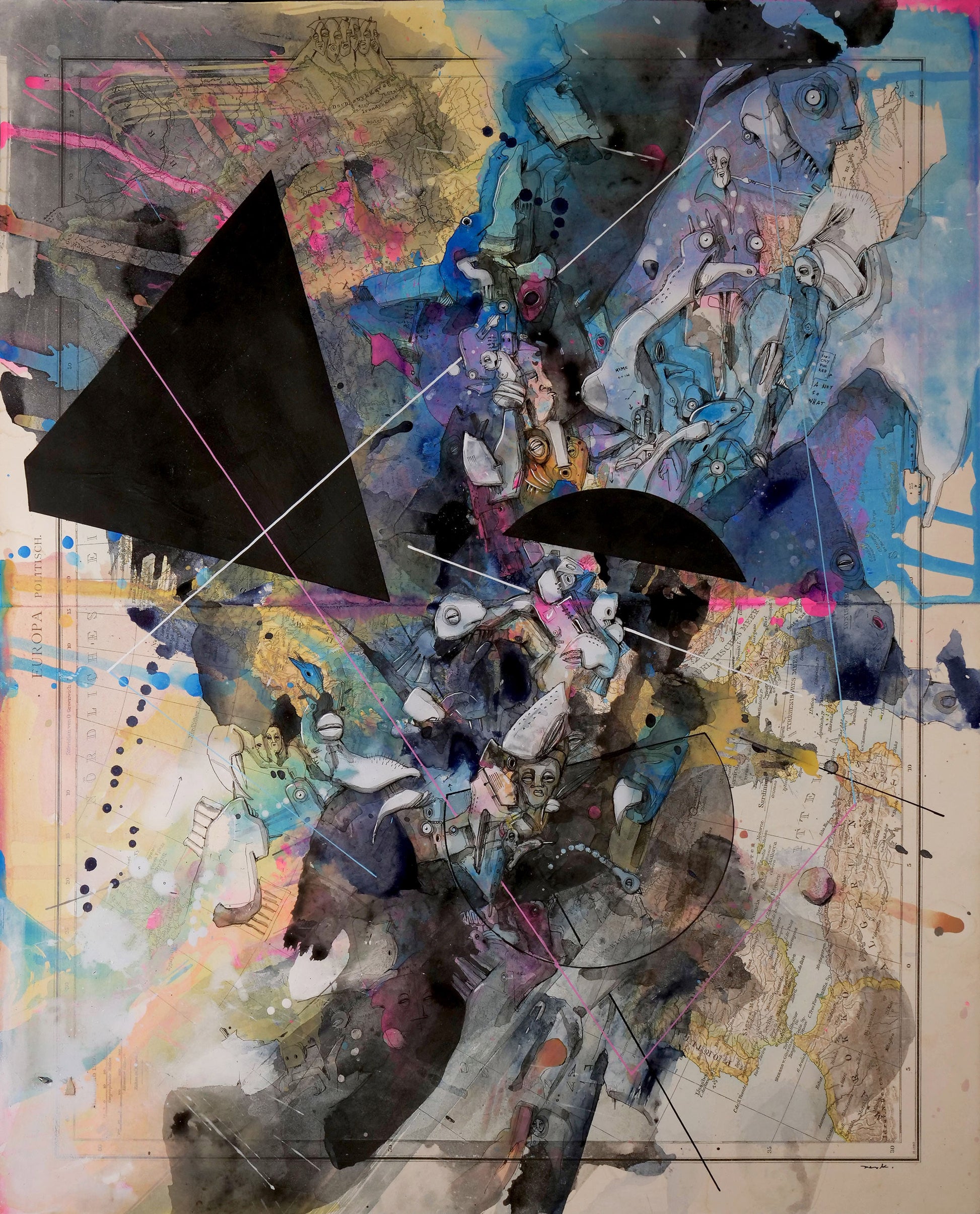 Dieses faszinierende Kunstwerk aus Peer Kriesels innovativer Serie "Übermalungen" transformiert eine herkömmliche Atlaskarte in ein visuelles Abenteuer. Auf dem vertrauten Untergrund einer Landkarte entfaltet sich eine surreale Welt, die Grenzen neu definiert und Perspektiven verschiebt. Die Kombination aus der ursprünglichen Kartographie und Kriesels künstlerischem Eingriff erzeugt einen fesselnden Kontrast, der den Betrachter sofort in seinen Bann zieht.
