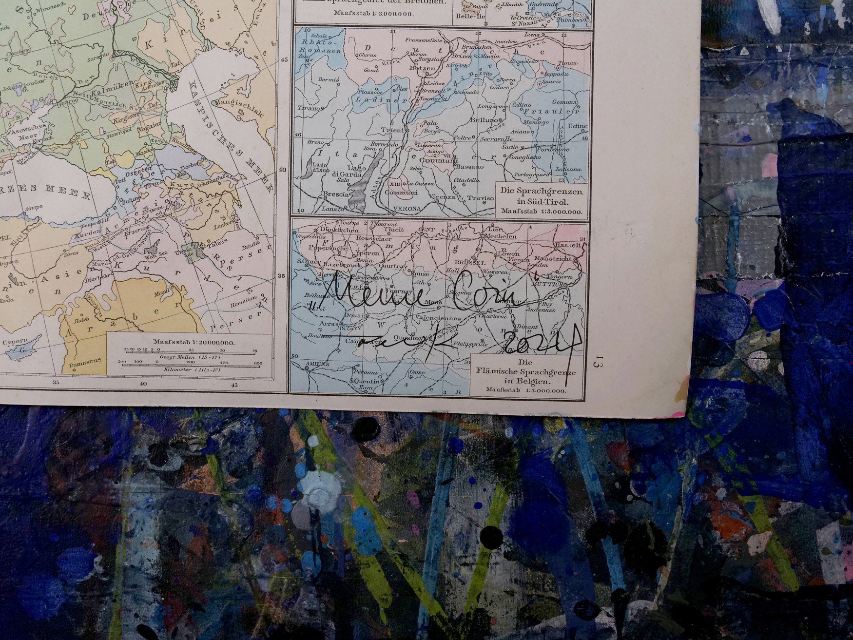 Kriesels künstlerische Vision manifestiert sich hier eindrucksvoll: Das Werk ist sowohl eine Hommage an traditionelle Kartographie als auch ein Kommentar zur Fluidität moderner Geographie. Die scheinbar chaotische, doch präzise komponierte Übermalung spiegelt die Komplexität unserer globalisierten Gesellschaft wider.