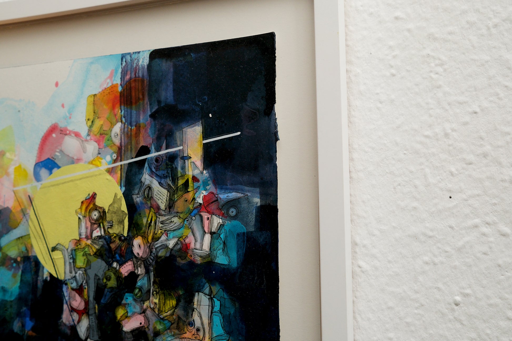 "Stille Teilhaber", aus der Wimmelbild-Werkreihe, ist ein faszinierendes Kunstwerk, das unsere moderne Gesellschaft in all ihrer Komplexität einfängt. Auf bunt grundiertem Papier entfaltet sich eine lebendige Welt, die mit Pigmenttinten-Fineliner detailreich ausgearbeitet wurde. Diese Kombination erzeugt eine Tiefe, die Betrachter sofort in ihren Bann zieht.