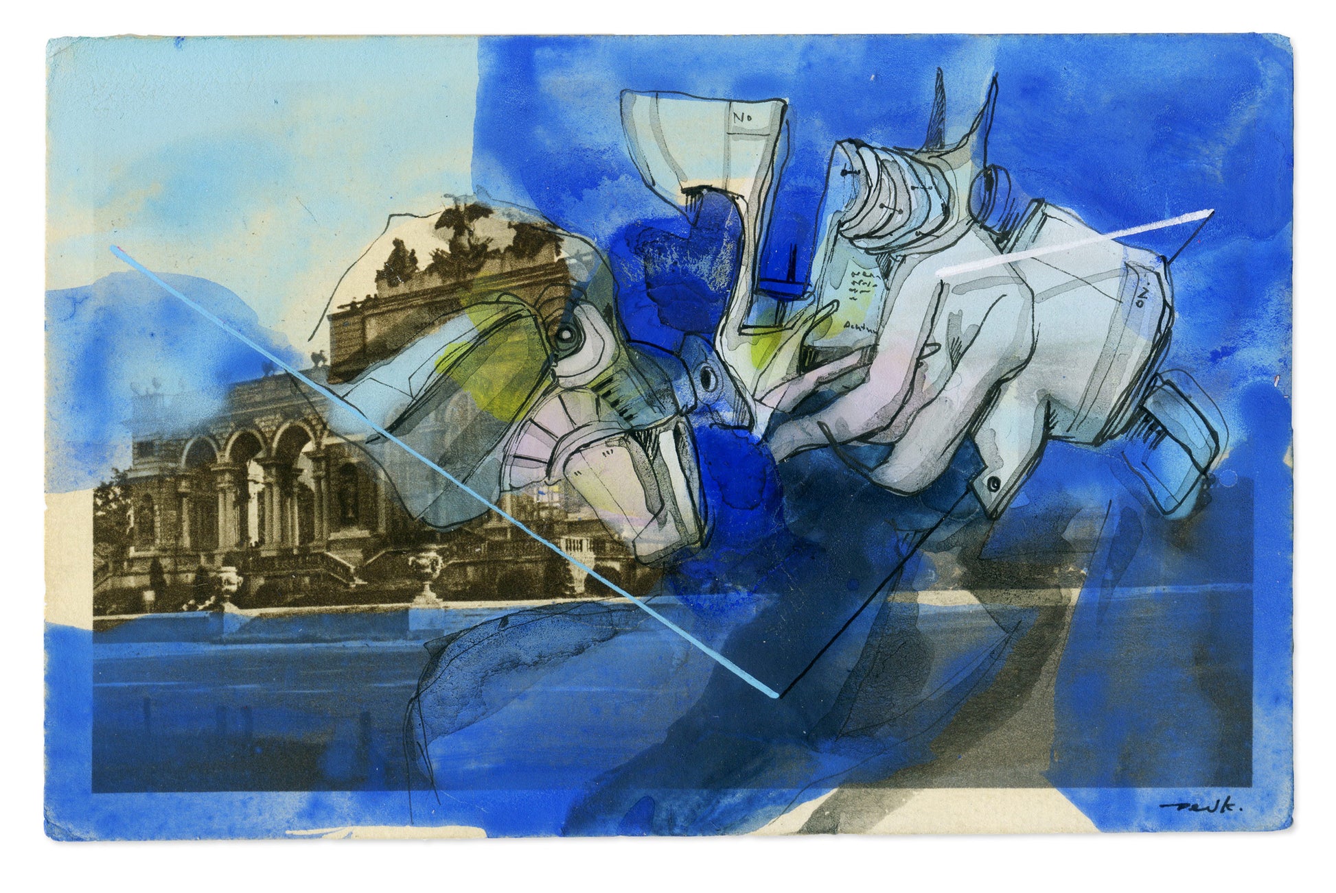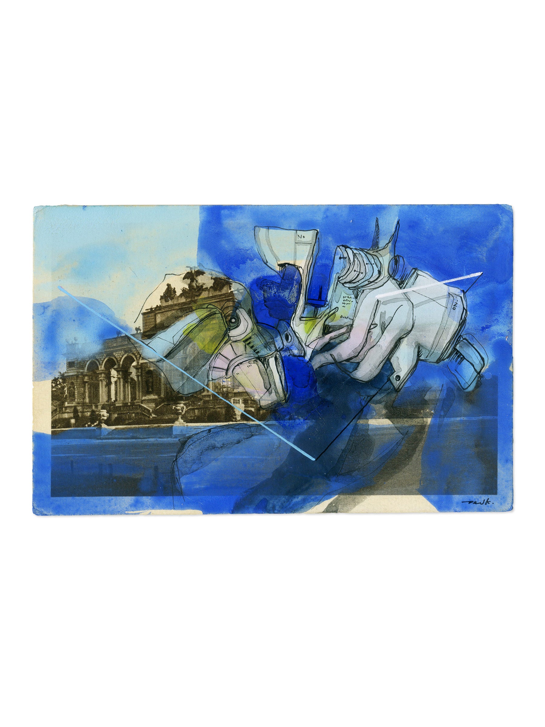 Eine Surrealistische Zeichnung (Unikat) aus der Werkreihe der Übermalungen (Postkarten).