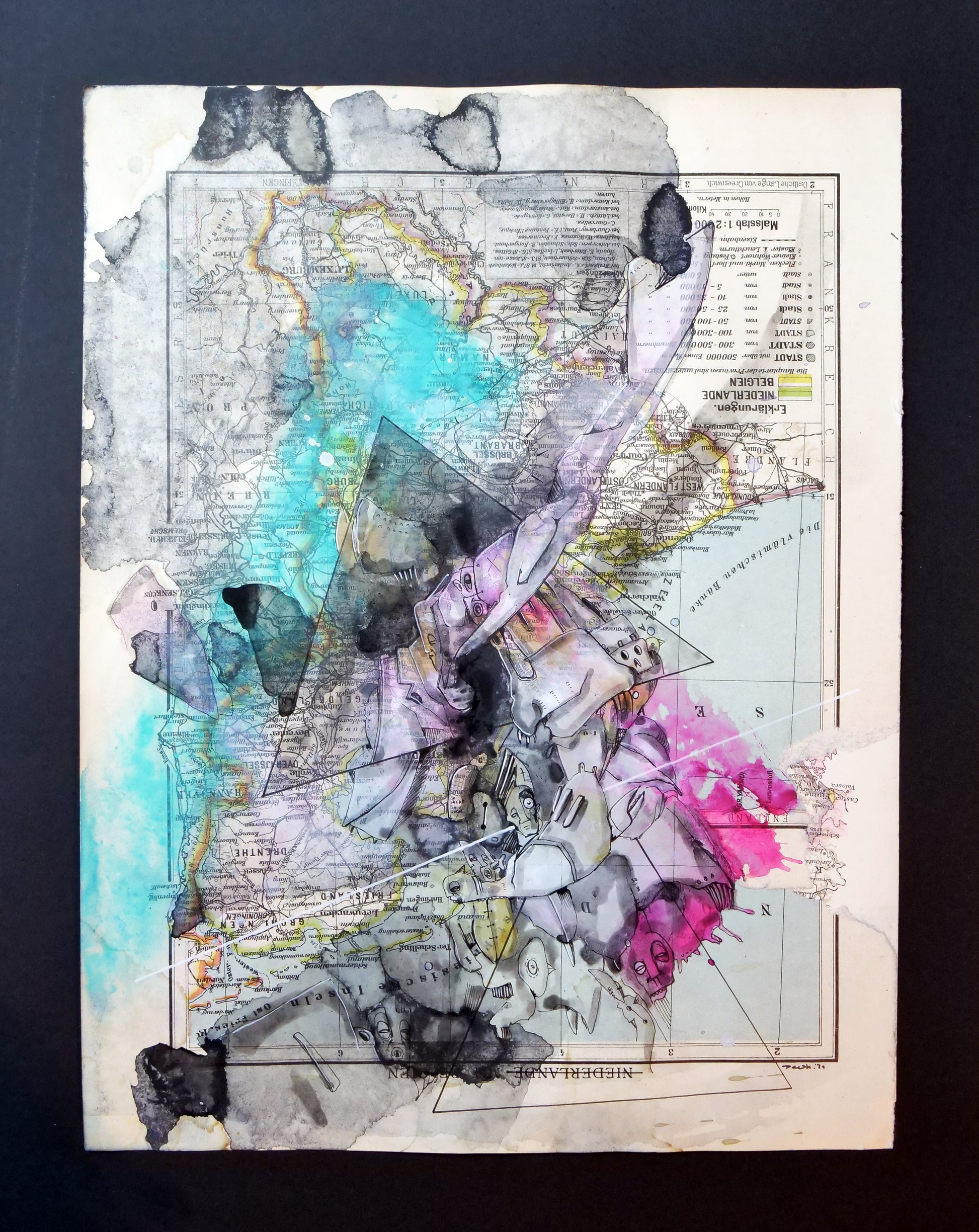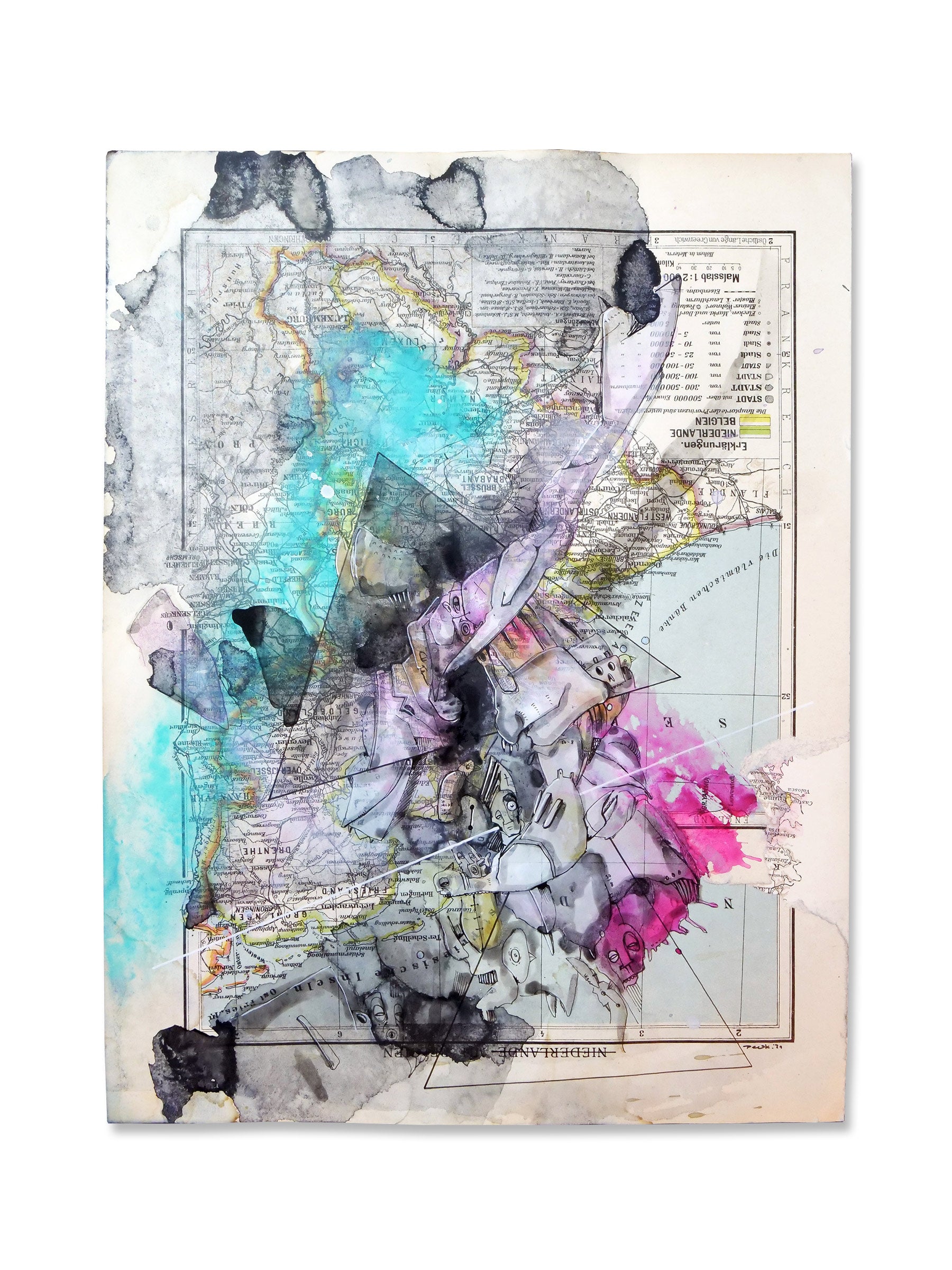 Aquarell/Acryl/Pigmenttinte auf Papier (Atlaskarte/Niederlande)
