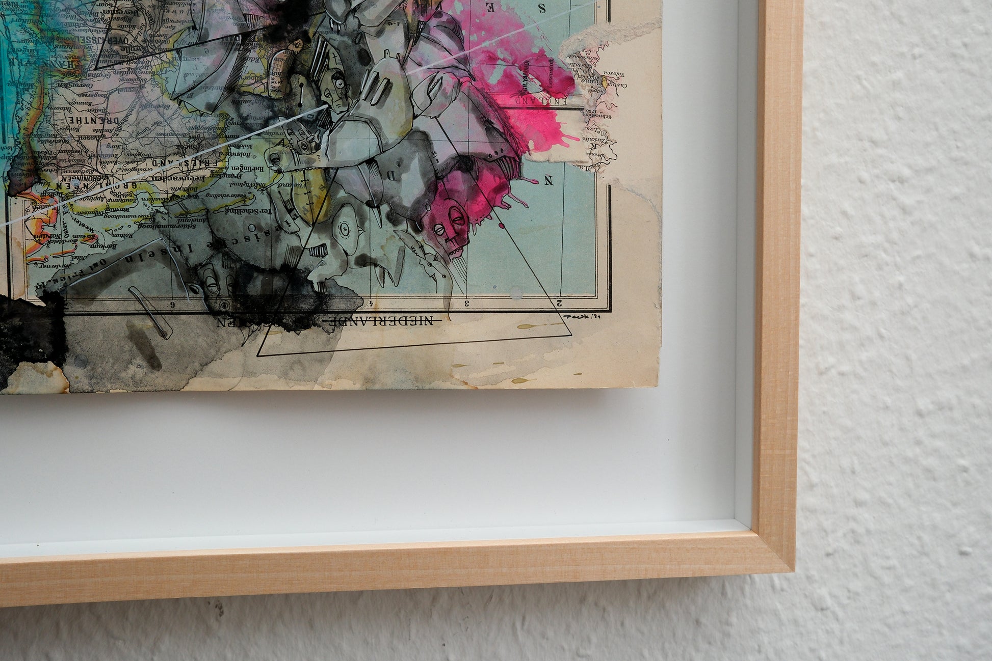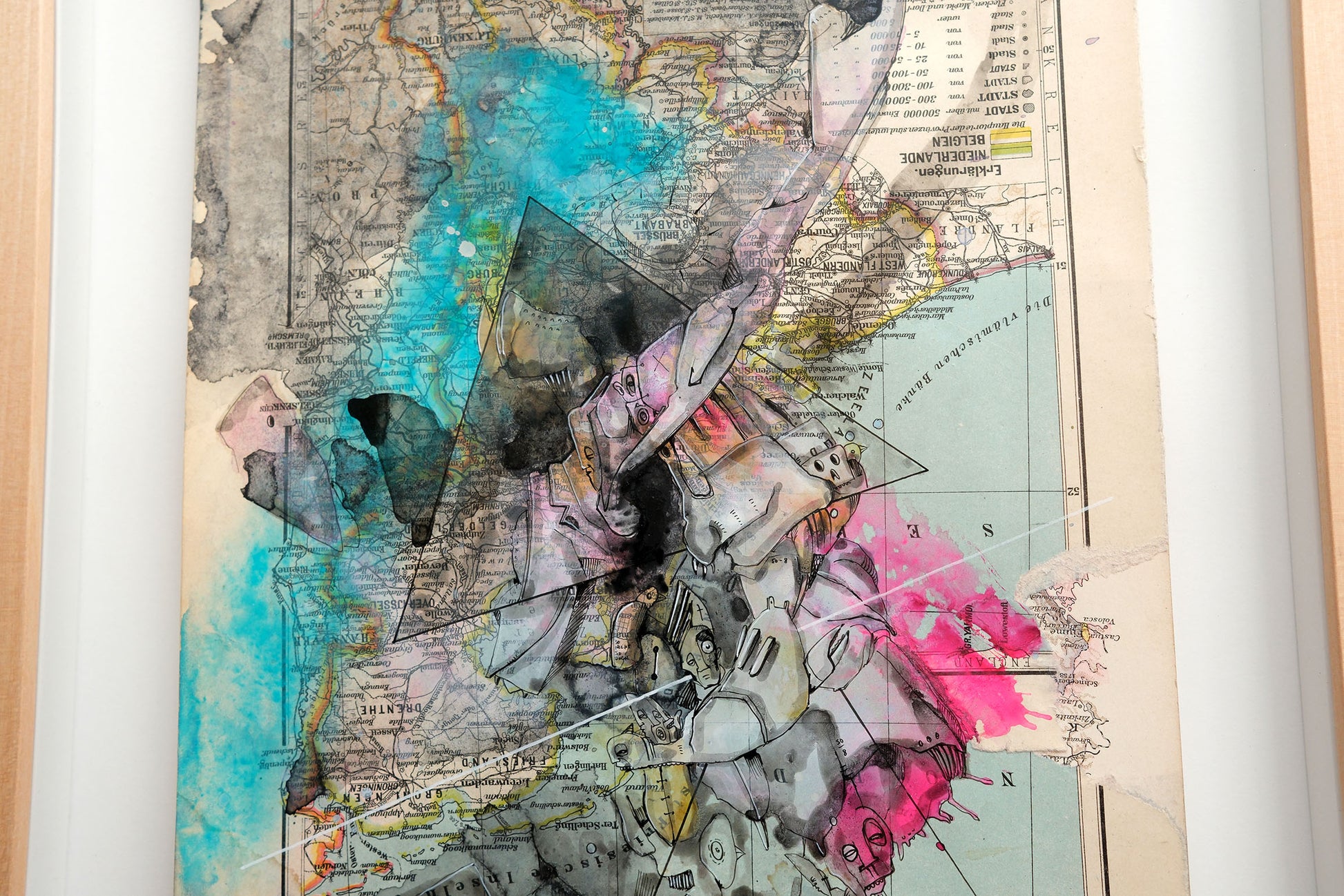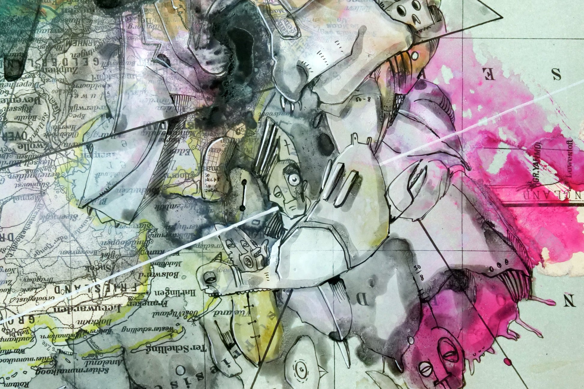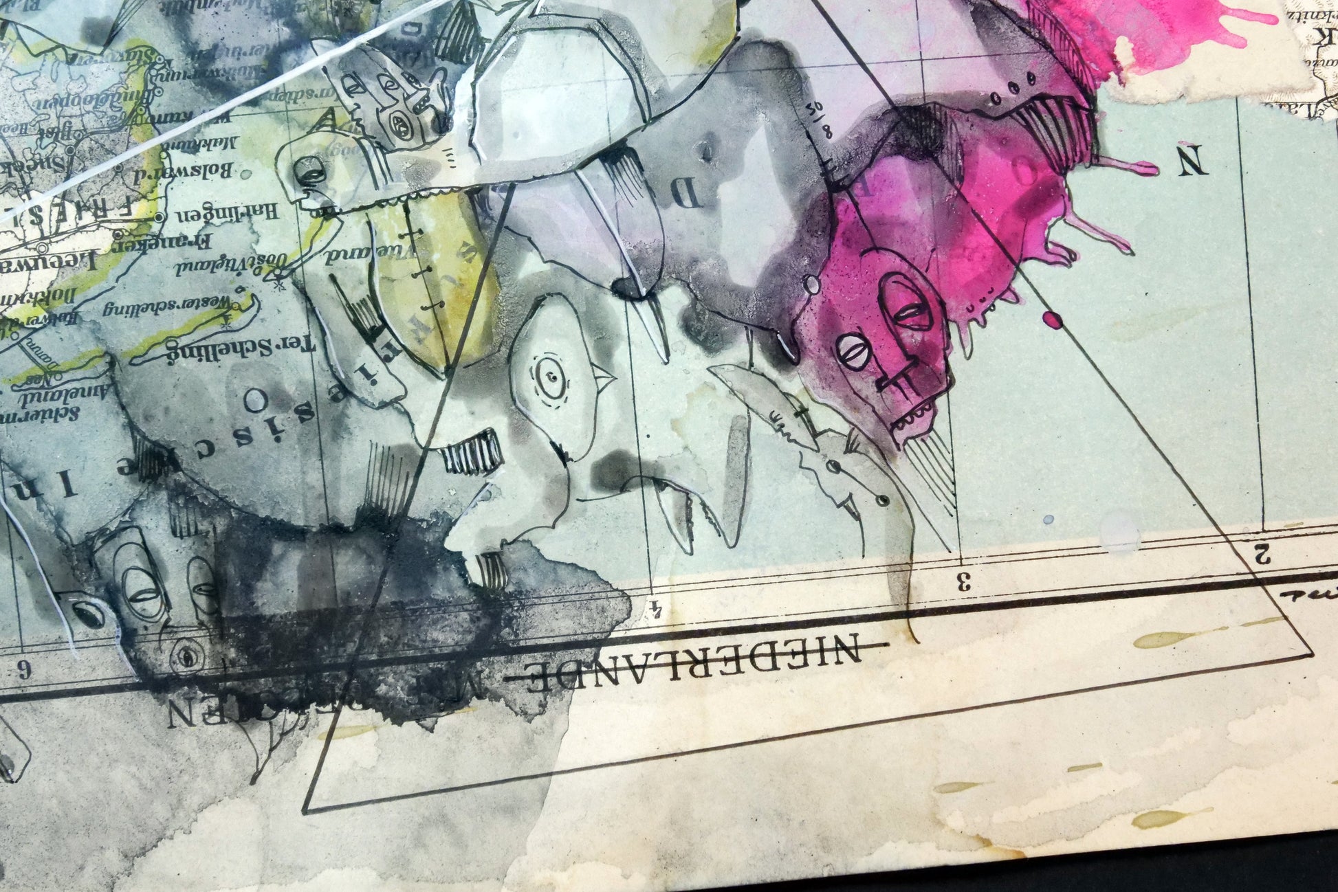 Im Zentrum des Werks steht die Übermalung mit Aquarell, Acryl und Pigmenttinte. Kriesels charakteristische Wimmelbilder, bevölkert von skurrilen Fratzen und fantastischen Figuren, überlagern und transformieren die geographischen Strukturen. Diese filigrane Zeichnung interagiert auf faszinierende Weise mit den Konturen und Farben der Karte und schafft so eine neue, imaginäre Topographie.